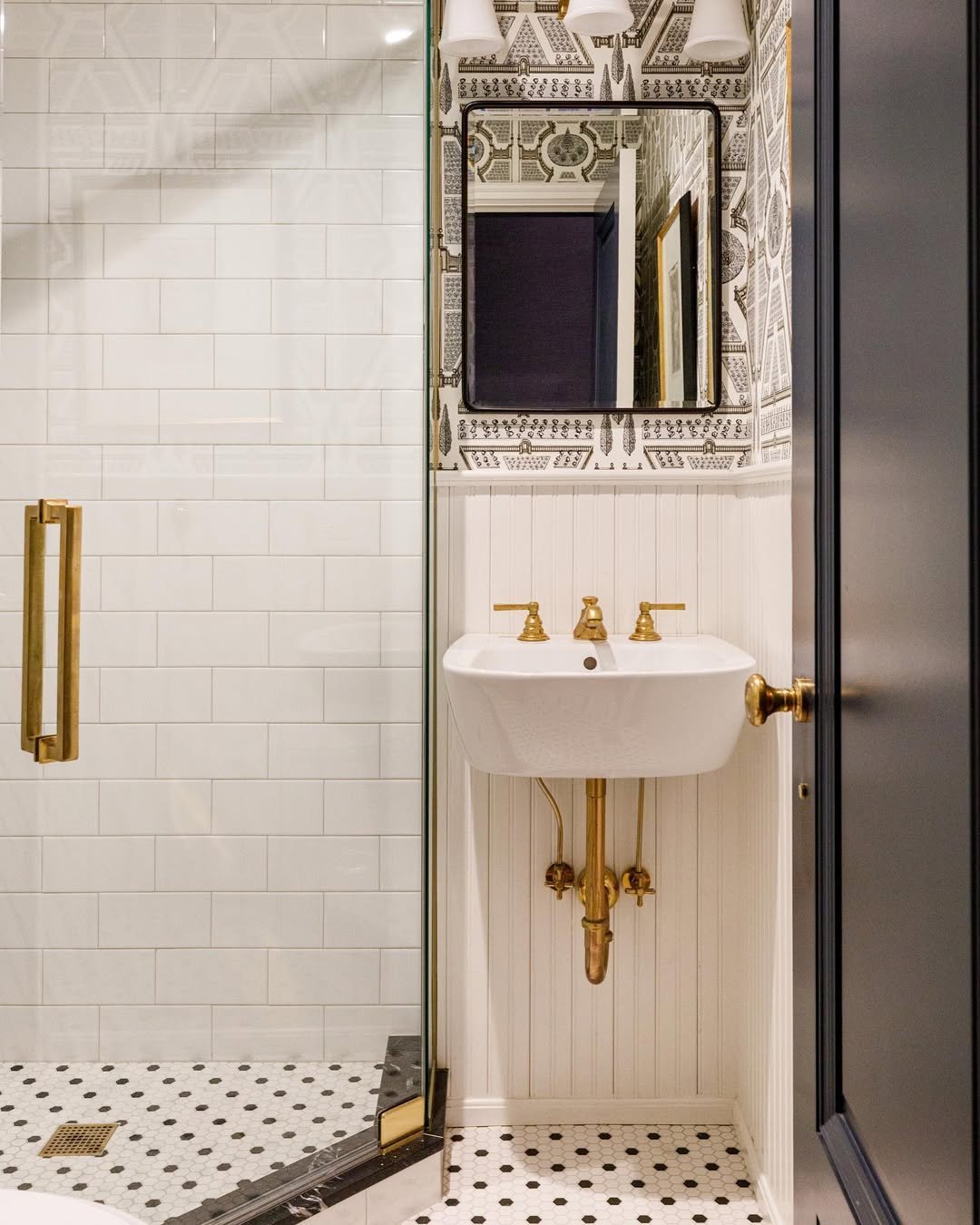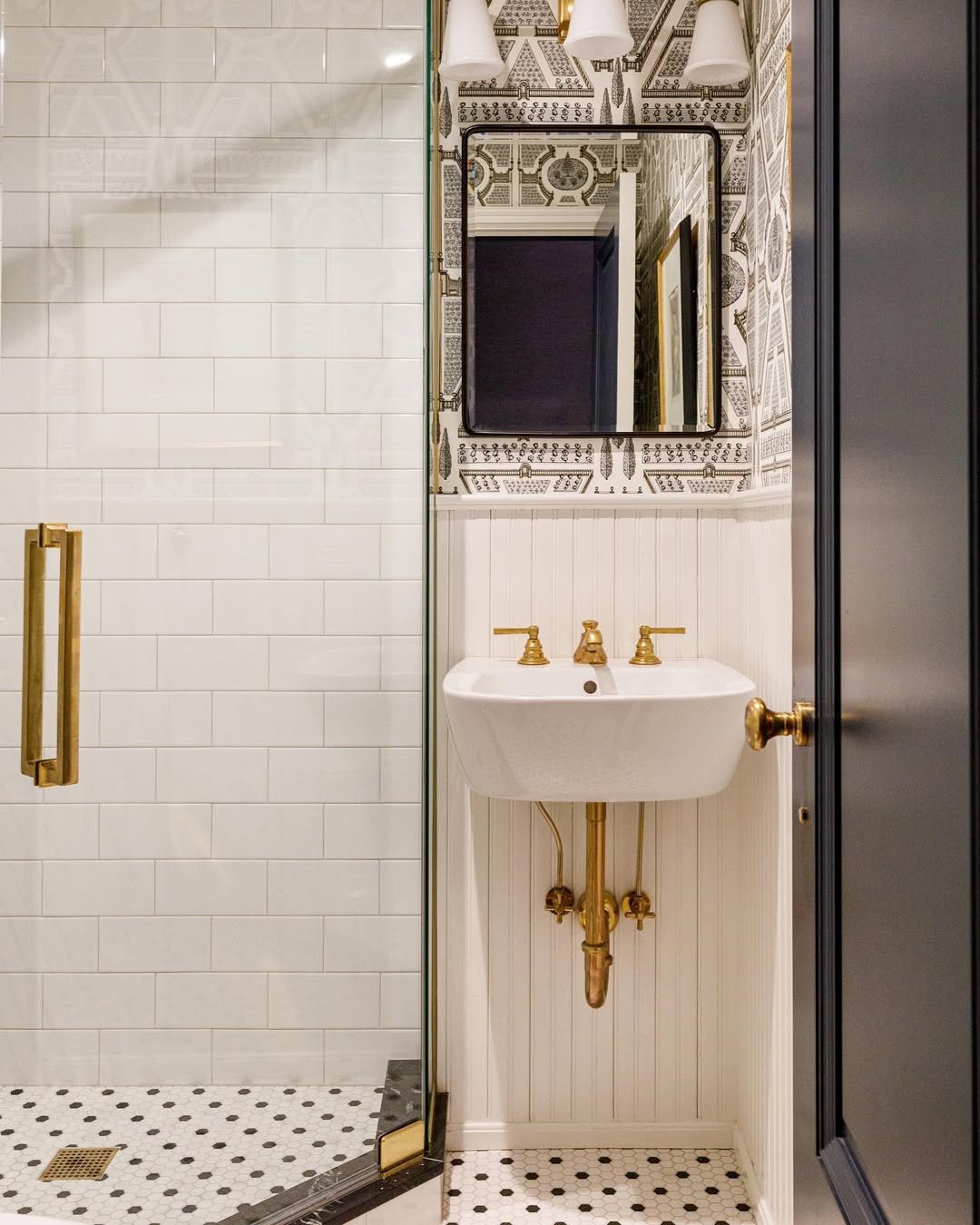 Paired with the brass sink and classic tile, it feels layered without feeling crowded. It’s proof that even the smallest bathroom can carry big personality.