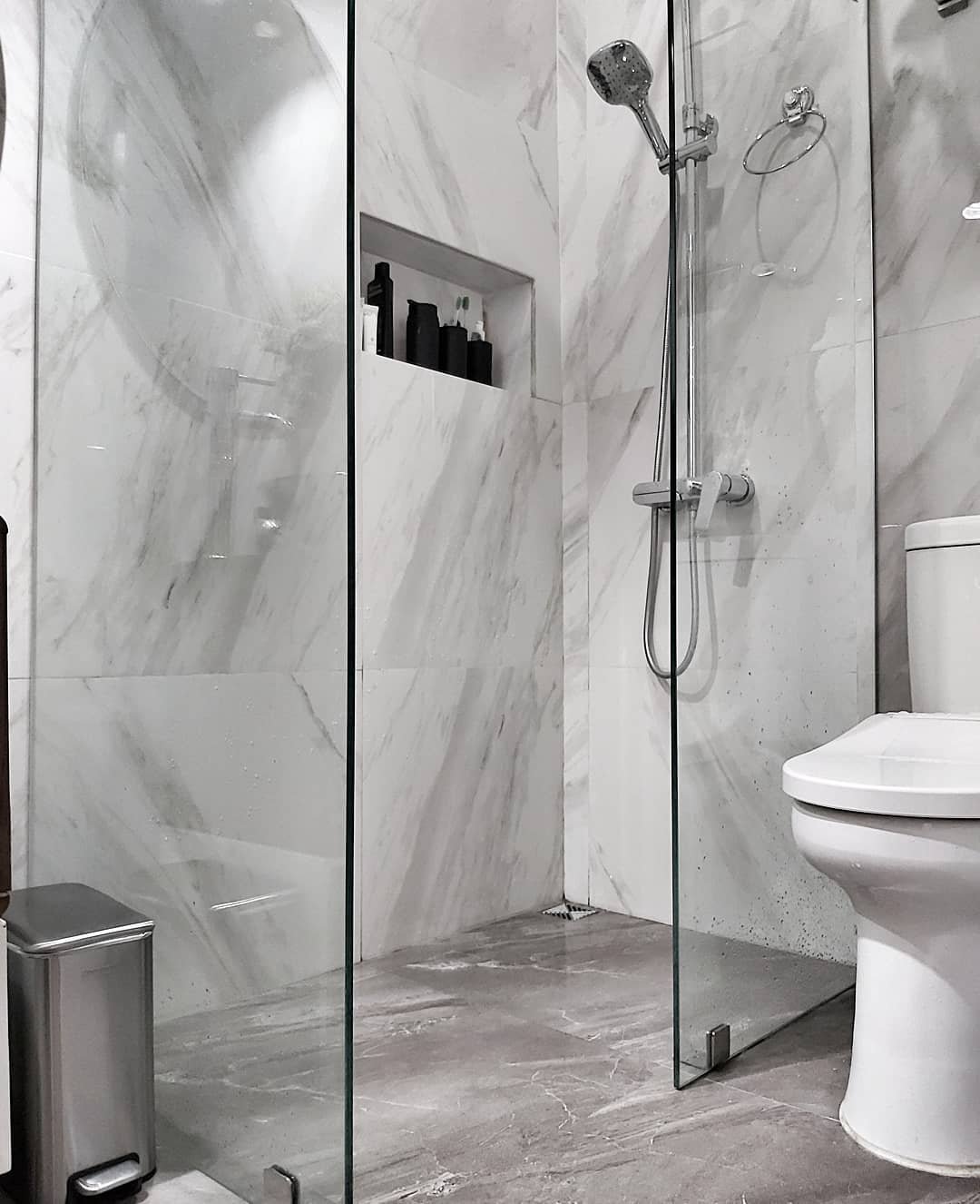 This one leans sleek and modern with that full marble look. It’s clean, seamless, and makes the whole space feel more expansive.