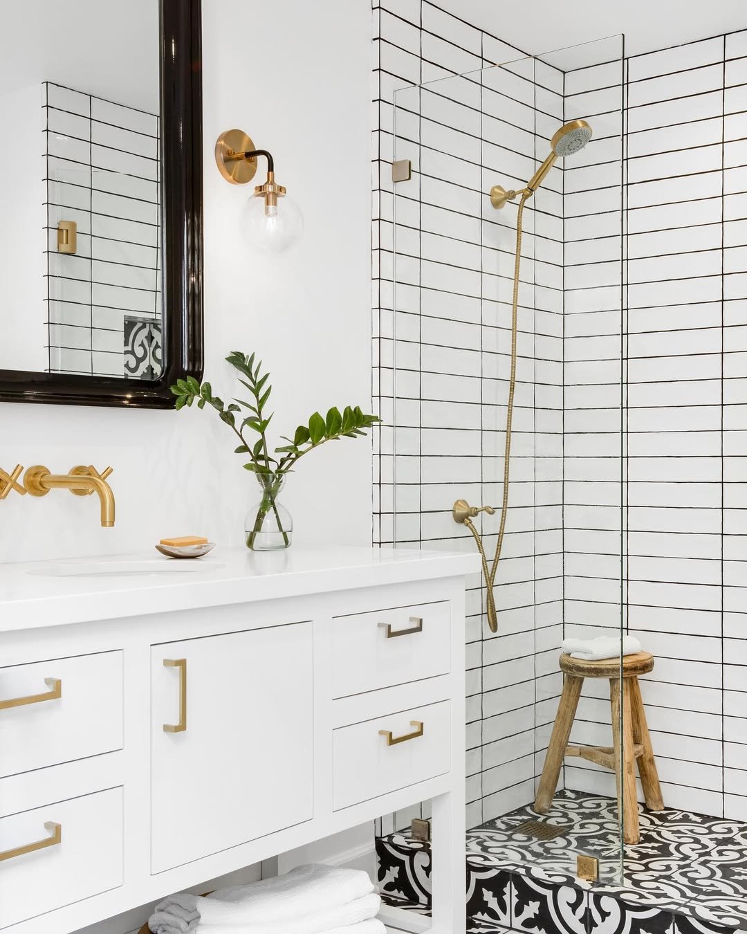 This bathroom is all about mixing patterns—but doing it with control. The floor tile adds energy, while the wall tile keeps things grounded and structured.