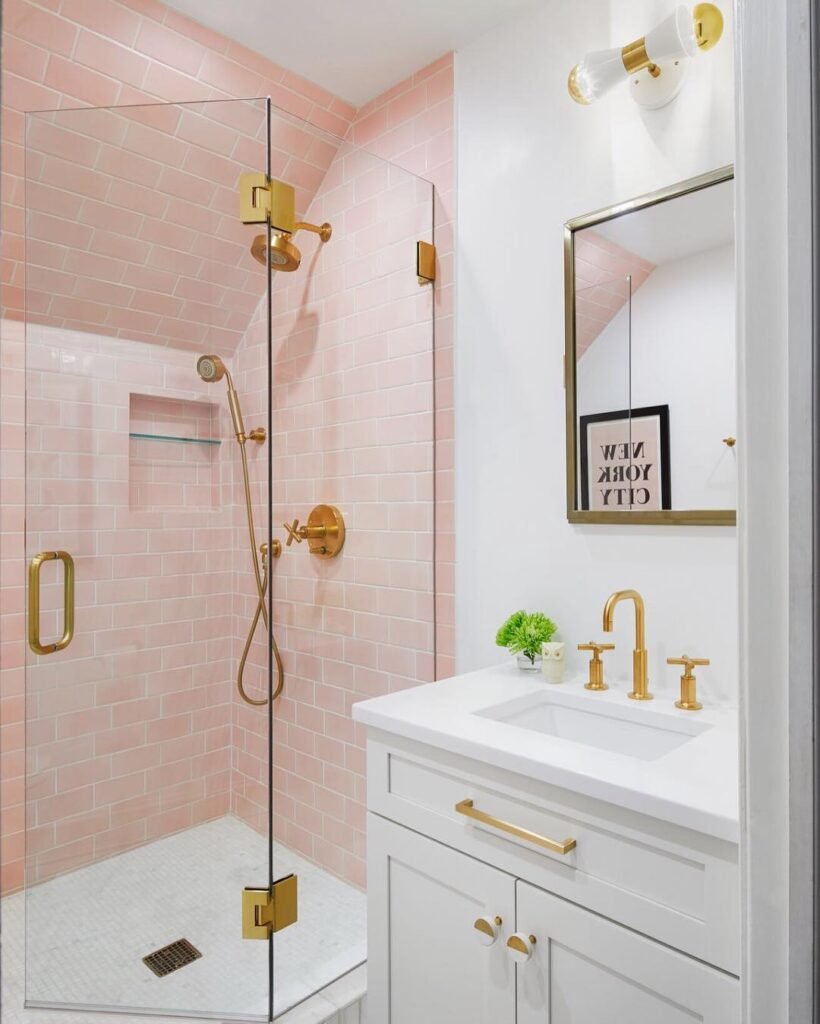 This one leans soft and feminine, but in a really modern way. The blush tiles paired with gold hardware create a look that’s elegant without feeling overly sweet.