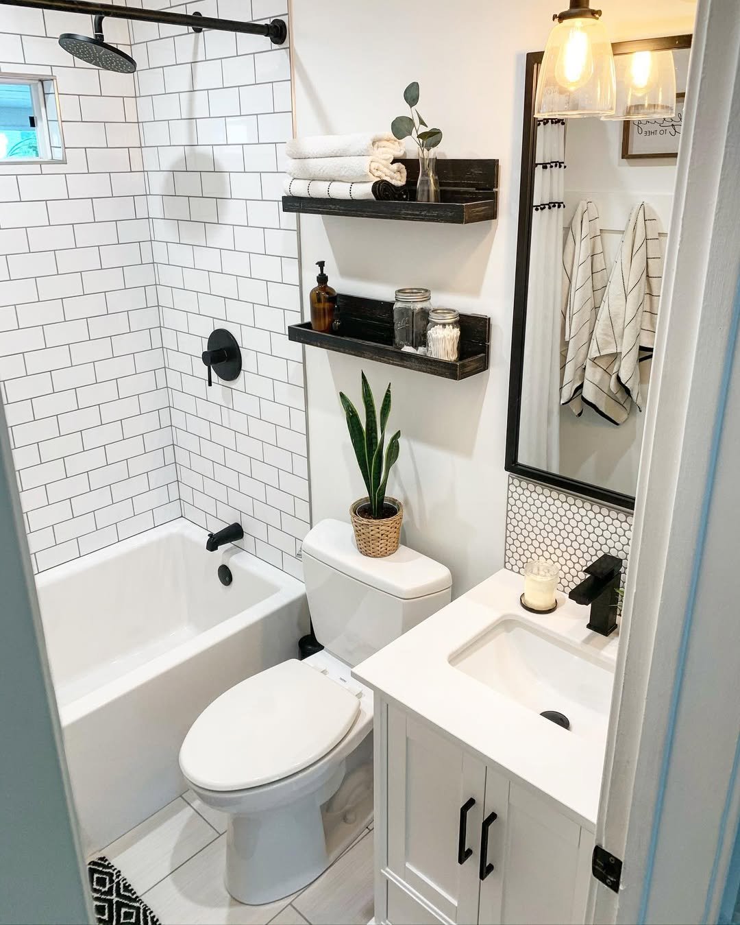 There’s something charming about this setup. The mix of classic tile, soft light, and little decor moments gives it that slightly vintage, collected-over-time feel.