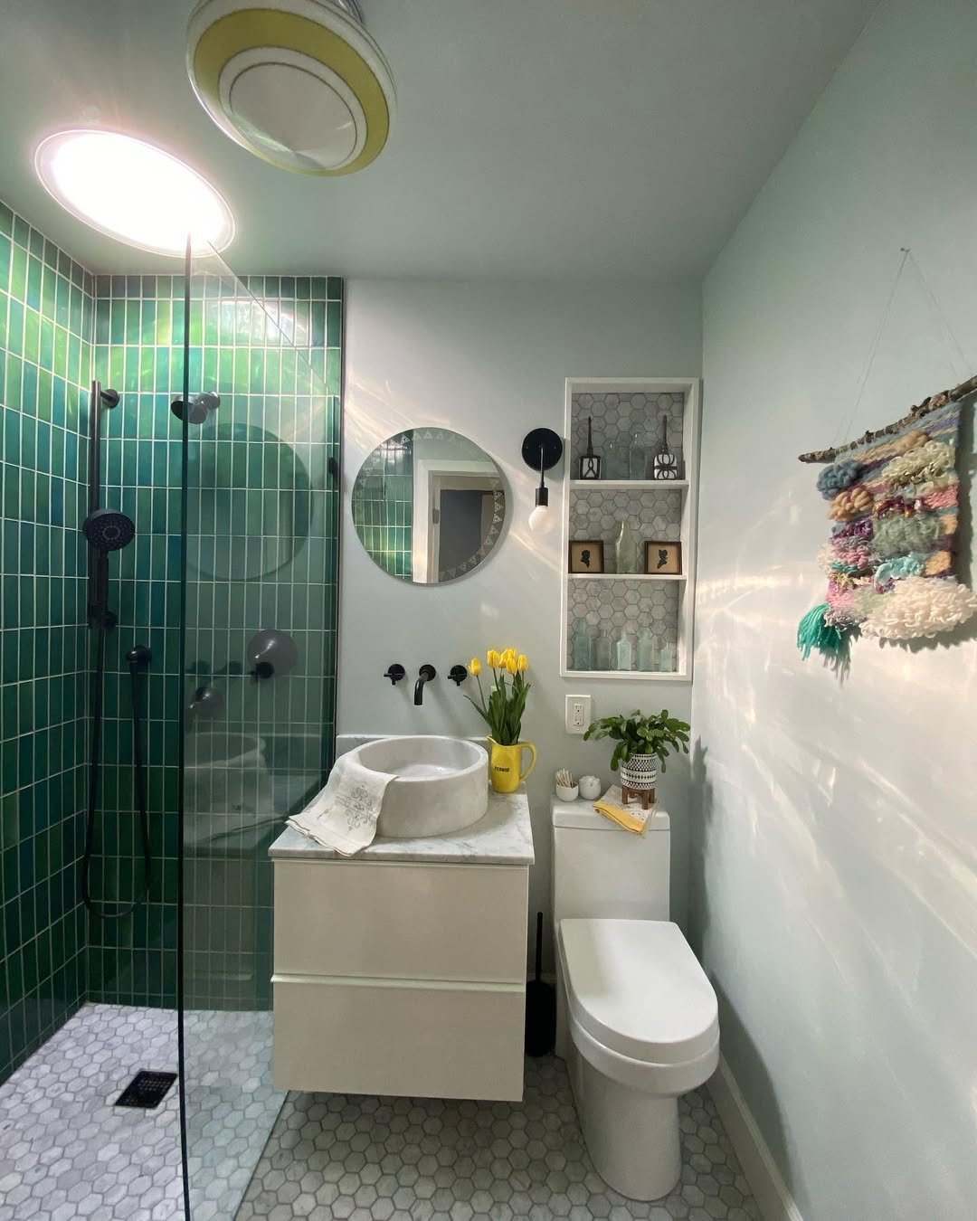 That green tile instantly brings life into the space. It’s fresh, a little earthy, and makes the bathroom feel more dynamic than your typical neutral setup.