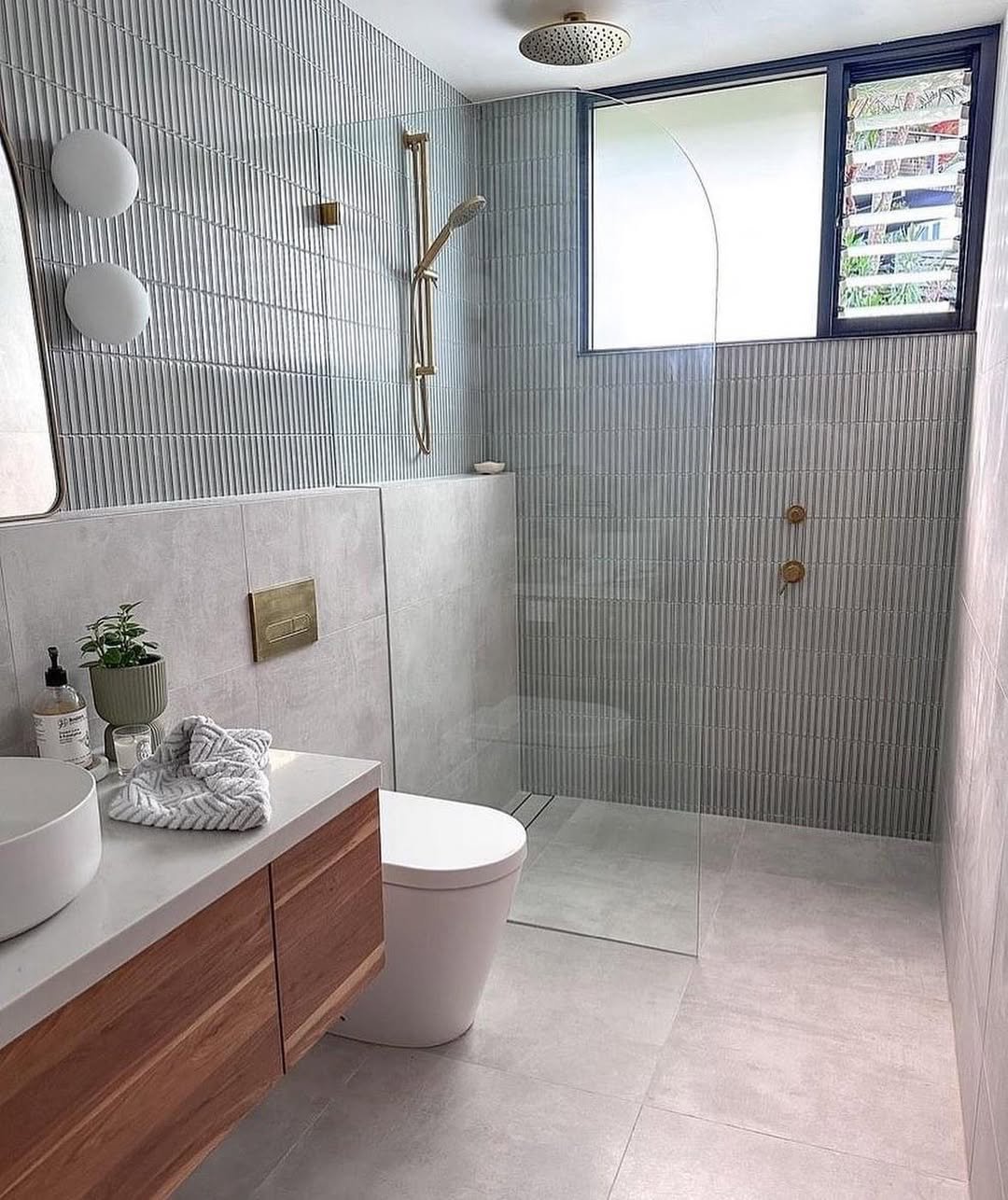 This space feels like a deep exhale. The vertical textured tiles instantly draw your eye upward, subtly stretching the room and making it feel taller than it is. Pair that with the soft gray palette and warm wood vanity, and you’ve got a balance that’s both modern and grounding.