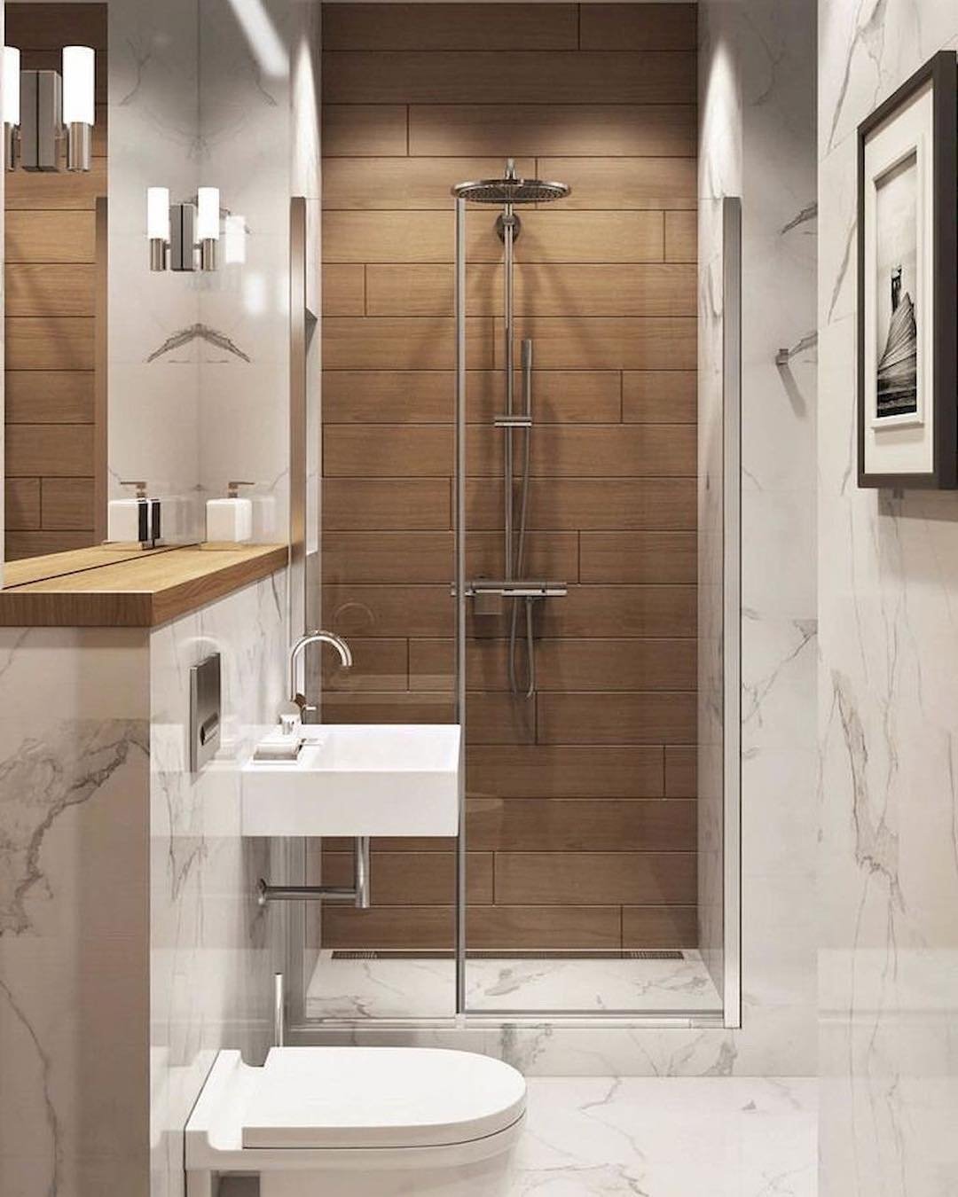 This one feels like a spa tucked into a city apartment. The wood-look tiles in the shower instantly warm up the space, breaking up all that marble so it doesn’t feel too cold or clinical.