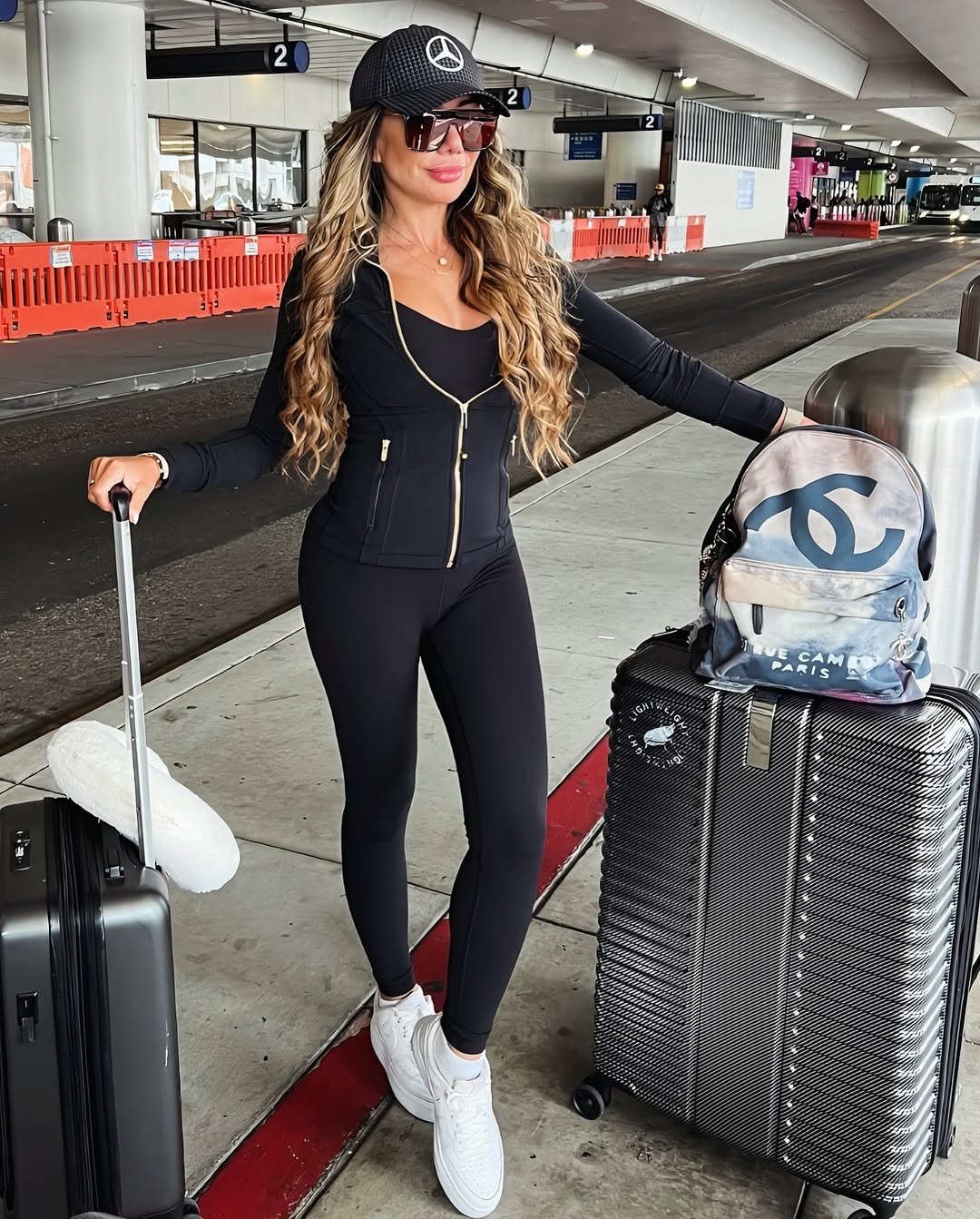 @veve6 is out here making TSA her runway. This all-black, ultra-sleek activewear look paired with oversized sunnies and THAT Chanel backpack is giving luxe traveler energy. The fit is snatched, the accessories are bold, and the vibe is “I woke up like this… on purpose.”