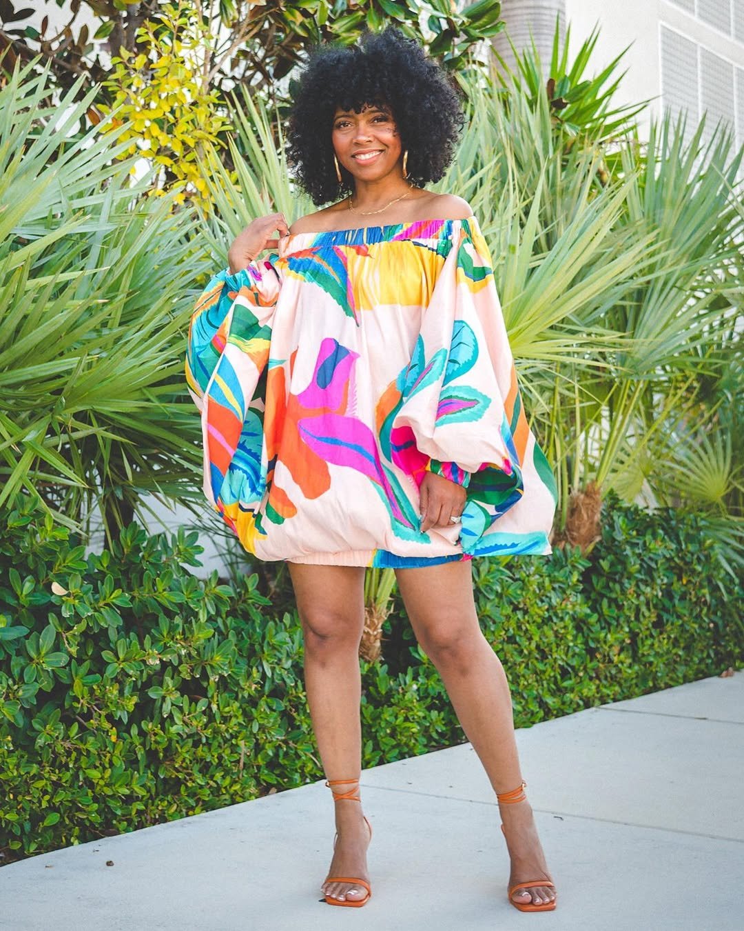 @sweneestyleblogger isn’t afraid of color—and thank goodness. This balloon-sleeved, off-shoulder dress is the fashion equivalent of a confetti cannon. Bright, bold, and unapologetically joyful, it’s made for vacation snaps that pop.