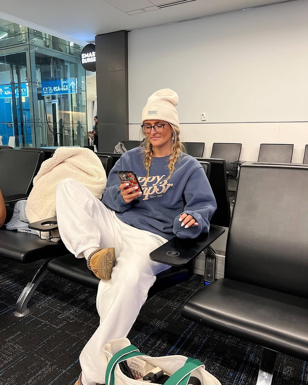 We’re living for @heyimlindz’s comfy-core airport fit. Slouchy sweatshirt? Check. Oversized sweatpants? Double check. UGGs, braids, and a beanie that says “I’m tired but vibing”? Triple check.