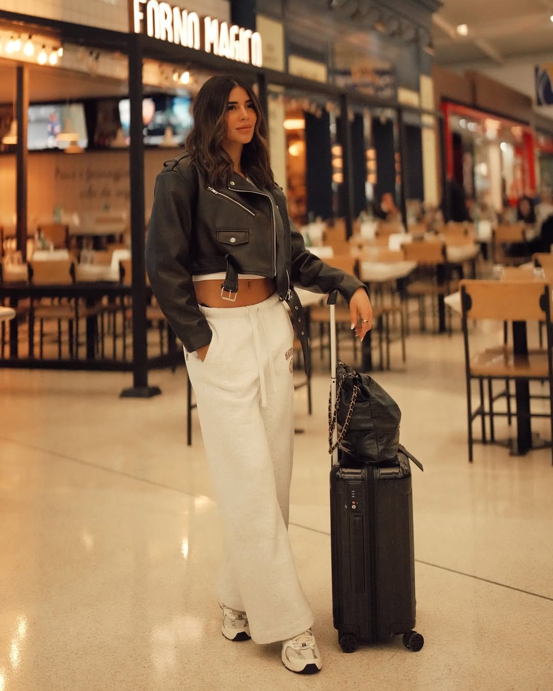 @stephcruzx3 makes an entrance—whether she’s actually traveling or just grabbing coffee near Gate B. The black leather cropped jacket over wide-leg white sweats is an unexpected combo that works. Paired with chunky sneakers and a luxe-looking carry-on, it’s airport cool with downtown edge.