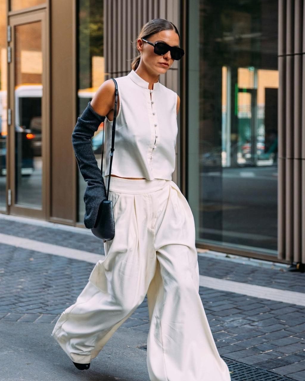 @vogueaustralia never plays it safe—and this offbeat pairing proves it. A sleeveless, high-collar top and dramatically wide trousers are already a power combo, but the slouched arm warmers? That’s next-level cool. It’s like a nod to haute couture with a side of IDGAF.