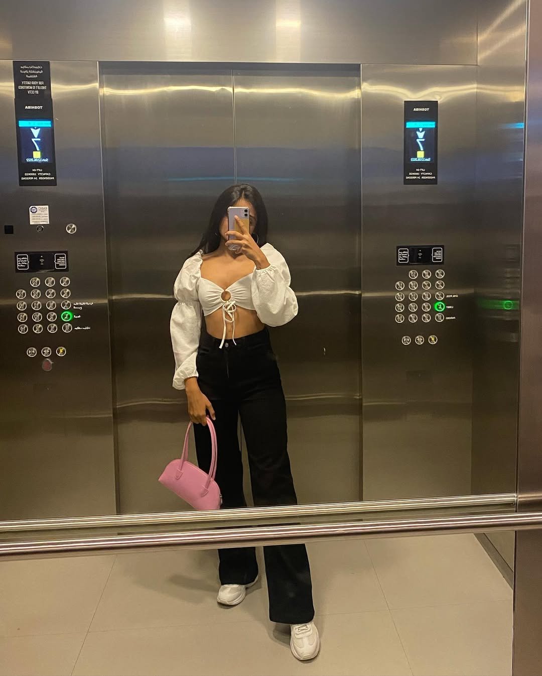 @zeel_nahar is out here turning elevator selfies into fashion content. That ruched tie-front crop top and flared high-waist jeans are giving date-night-meets-casual-cool. The little pink purse? She understood the assignment.