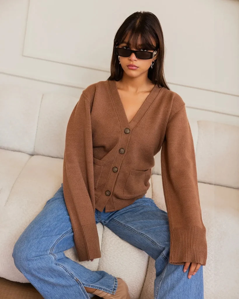 @knitfinity.eg is that girl who nails knitwear, even at 35,000 feet. Her chunky brown cardigan and relaxed denim combo is effortlessly stylish without trying too hard. Add those dark sunnies and she’s basically her own VIP lounge.