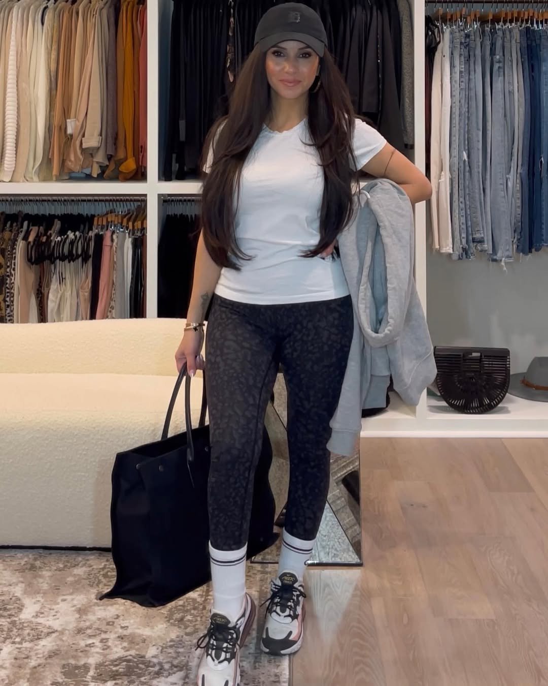 @ritasalmo is showing us how to do travelwear right—again. This sporty-chic combo of sleek leggings, a crisp white tee, and a baseball cap is the ultimate “catching flights, not feelings” vibe. The chunky sneakers and oversized tote scream “seasoned traveler,” while the cozy grey pullover casually slung over the arm? That’s just confidence.