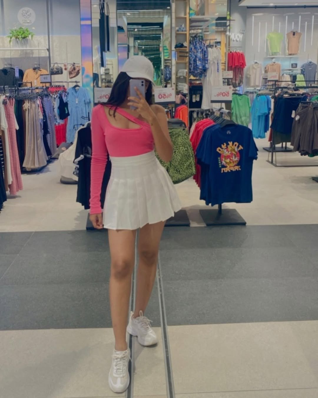 White sneakers and a white cap keep it grounded, but the whole vibe screams confident, fun, and “catch me in the Zara fitting room mirror, striking poses.”