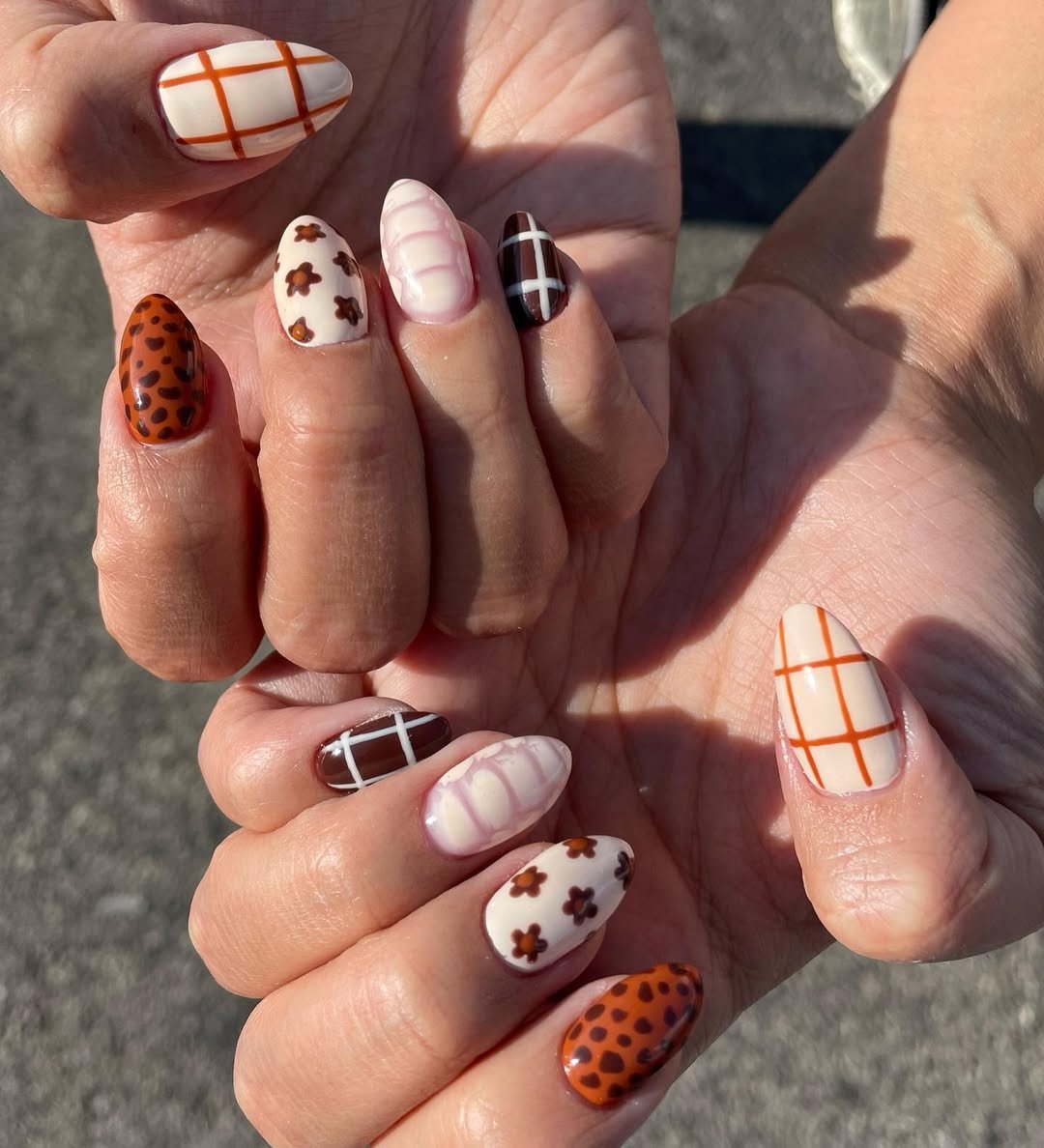 The almond shape keeps it elegant, while the mix of solids and print adds personality without overwhelming the look. It’s giving pumpkin spice energy—but make it chic.
