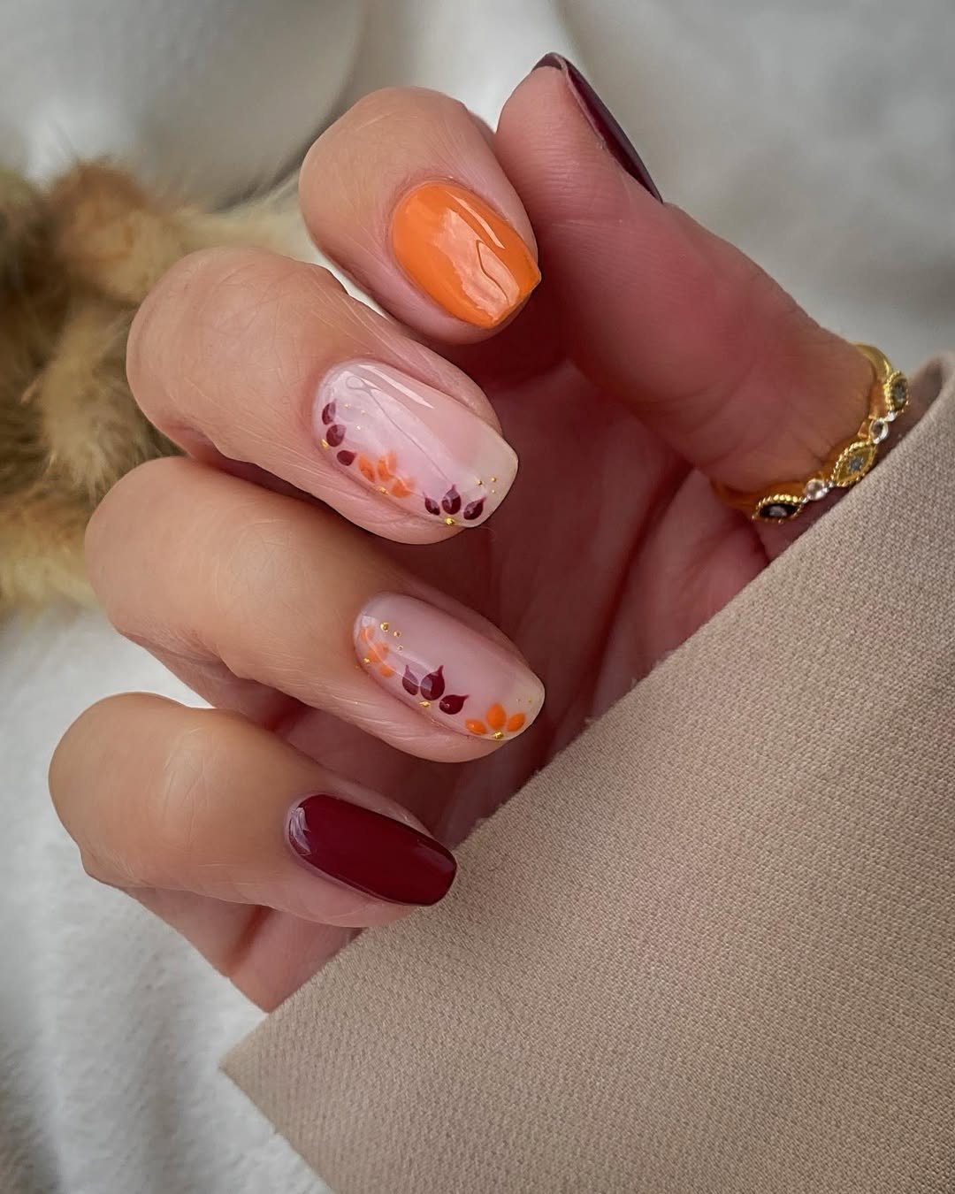 The contrast between bold and delicate keeps it balanced. It’s feminine, slightly romantic, and perfect if you want something seasonal without going full brown-and-orange.