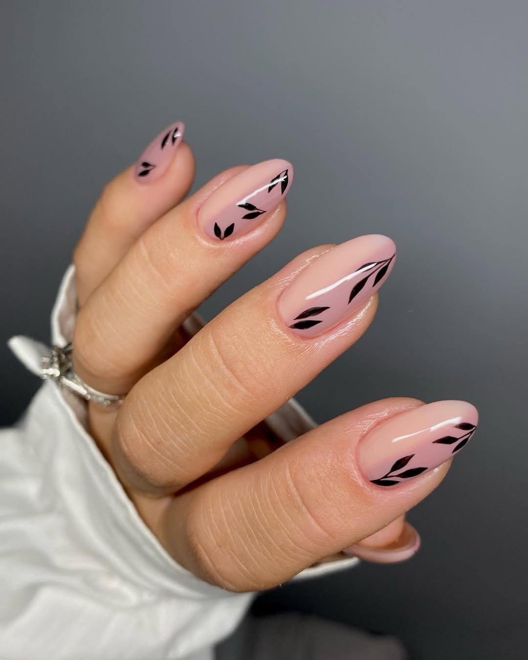 Soft pink almond nails paired with sleek black leafy accents? This is fall florals, but make them modern. The contrast between the delicate base and sharp black detailing feels fresh and stylish.