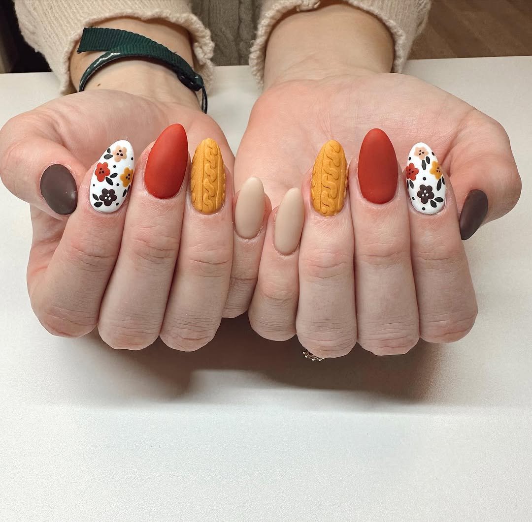 These pointed almond nails feature hand-drawn white and burnt orange florals over a sheer nude base, and they feel straight out of a chic autumn sketchbook.