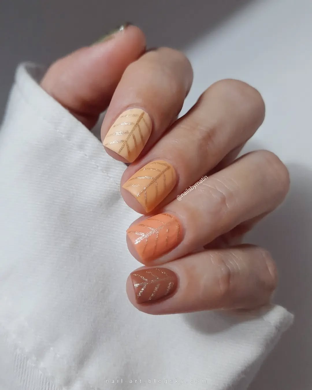 Soft matte tones in mustard, peach, and warm brown, topped with delicate gold leaf detailing? This is fall bottled up into a manicure.