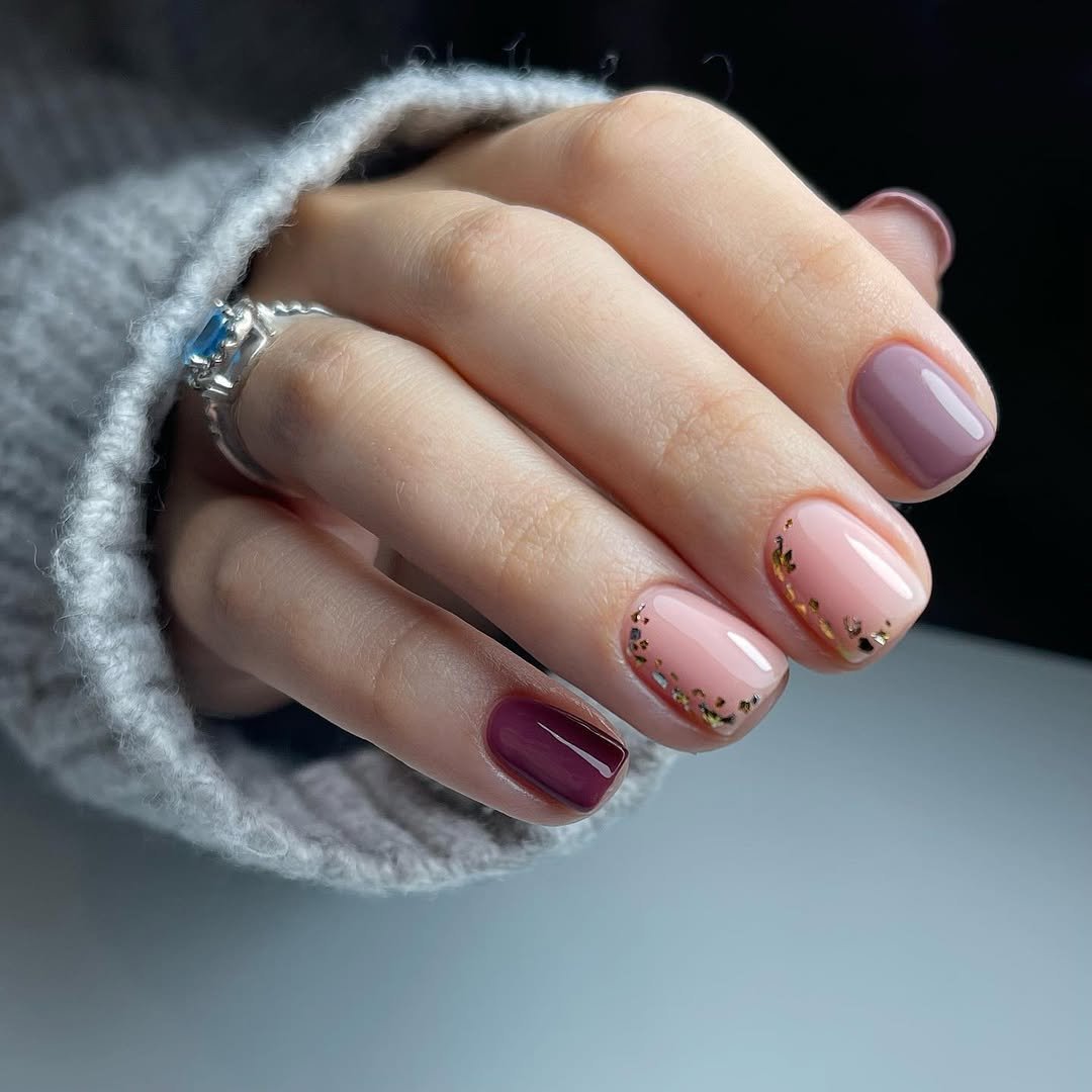 Now this is a fresh twist on fall tones. A glossy deep berry paired with a soft pink accent nail featuring delicate leaf details and tiny gold flecks? Yes please.