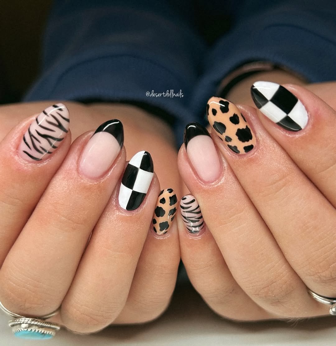 If you can’t pick one trend, wear them all. Zebra, leopard, checkerboard, and classic black French tips—all in one cohesive set. Somehow, it works.