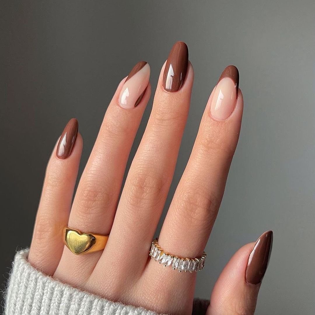 This glossy brown-and-nude mix is proof that simple doesn’t mean boring. Alternating chocolate French tips and creamy solid nails create that perfect balance.