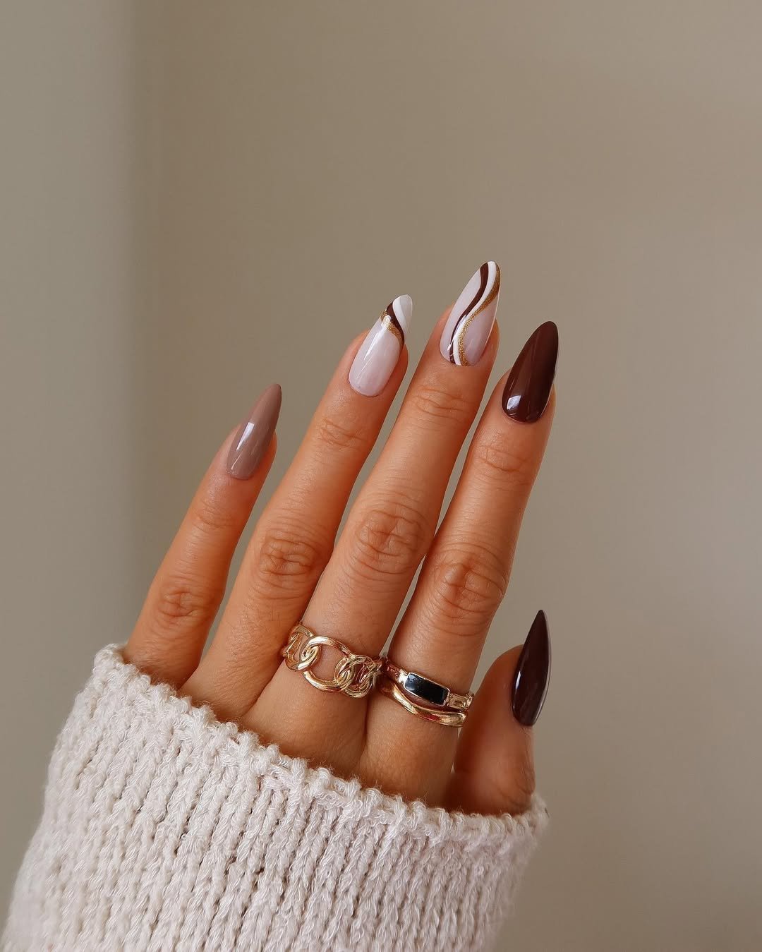 This set is basically your favorite fall latte turned into nail art. You’ve got creamy nude, rich chocolate brown, and those soft white-and-gold swirl accents that tie everything together so effortlessly.