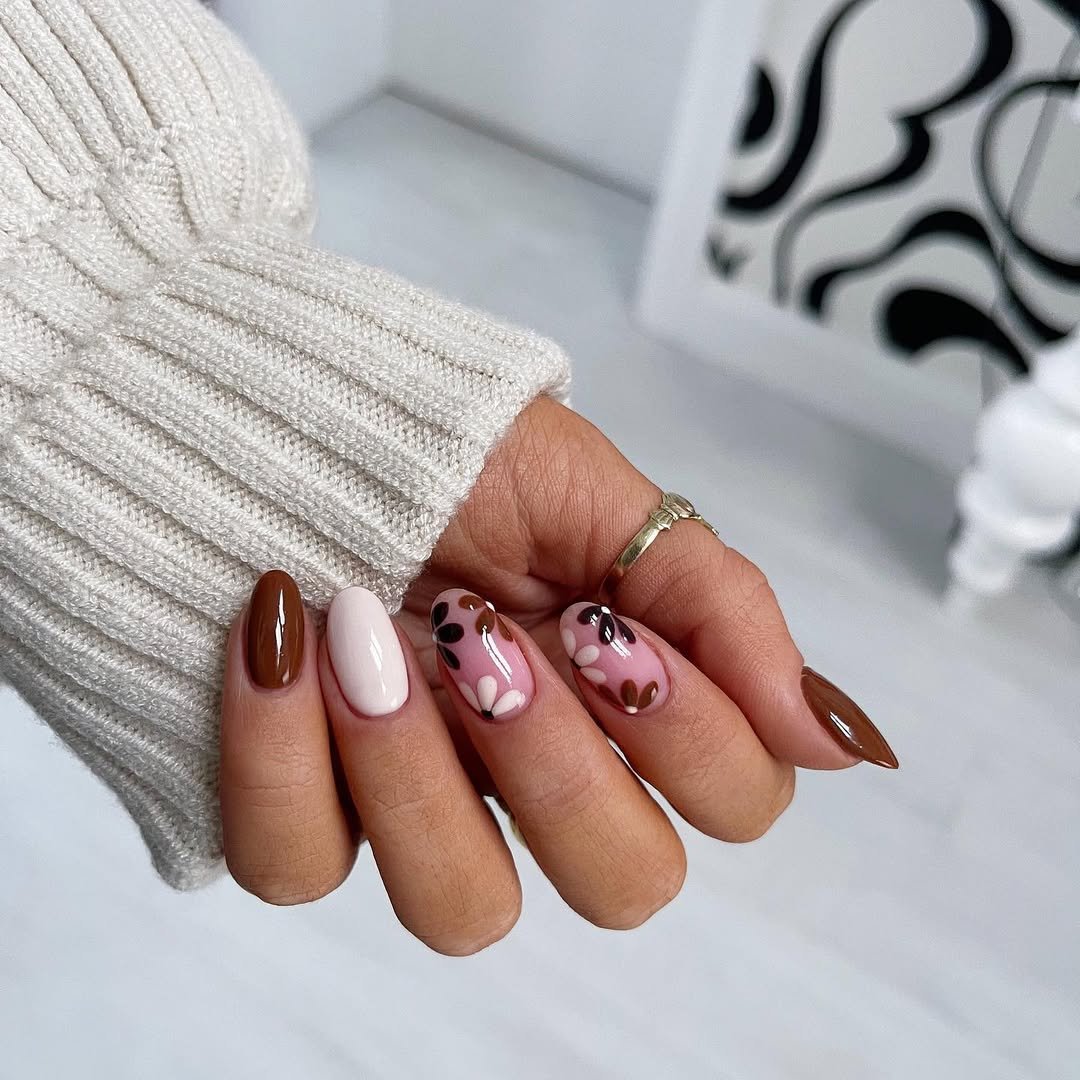 Now this is how you mix bold and soft. Deep chocolate brown nails paired with baby pink accents and a dreamy marble swirl? It’s rich but playful.