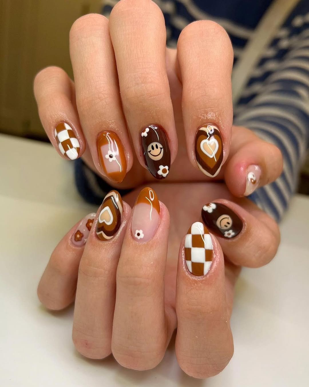 Each nail tells its own little story, but the warm brown and burnt orange palette keeps everything cohesive. It’s playful without looking chaotic. The kind of manicure that makes you want to hold your coffee cup just a little higher.
