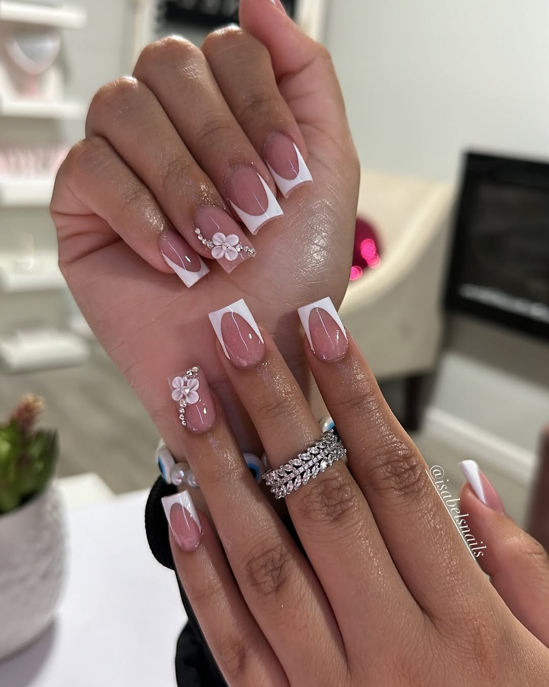 A classic French tip… but make it romantic. The crisp white tips paired with delicate 3D flowers and tiny rhinestone details instantly level this up from simple to stunning.