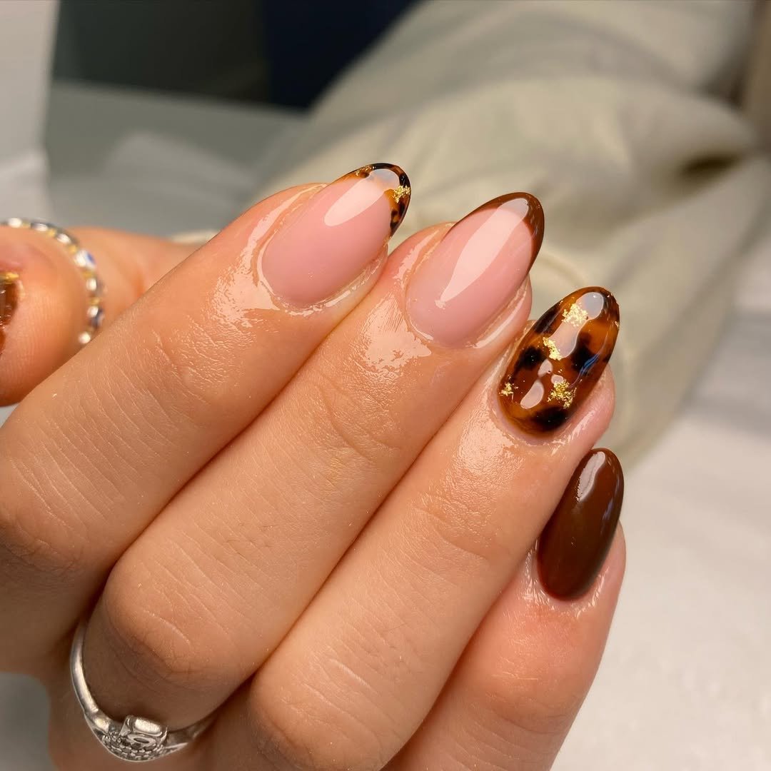 Tortoiseshell tips with gold foil accents? Say less. The warm brown tones mixed with that glossy nude base feel so perfectly fall-coded.