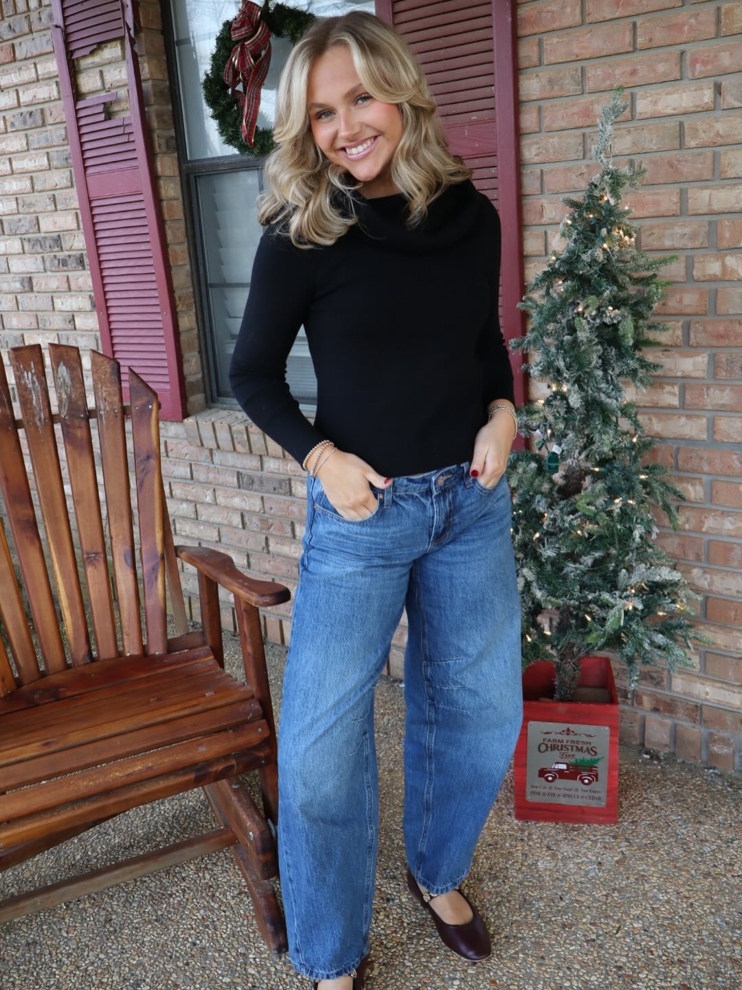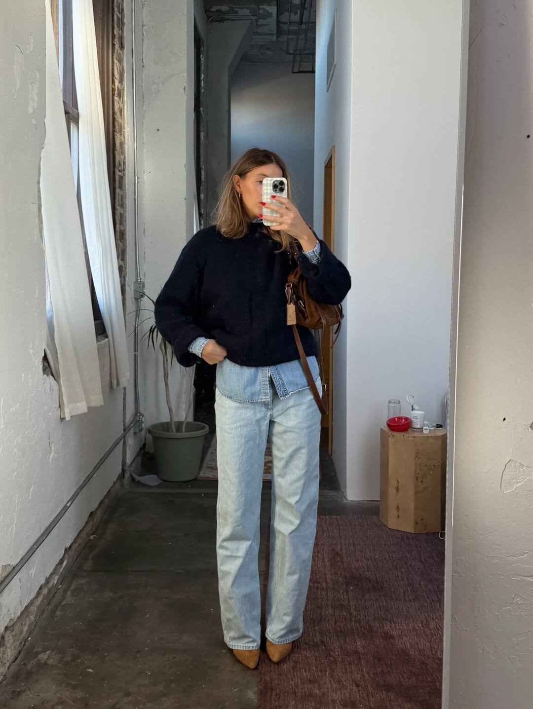This one feels soft and cozy but still intentional. The fitted top with wide denim keeps the silhouette relaxed yet flattering.