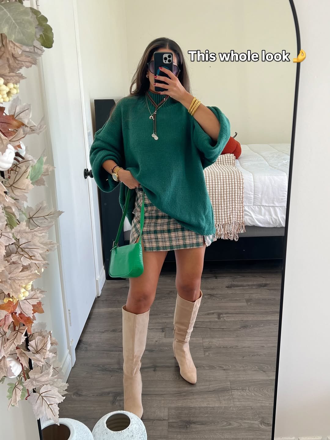 This look plays with volume, texture, and color in a way that feels bold but wearable. The oversized knit paired with boots keeps it grounded.
