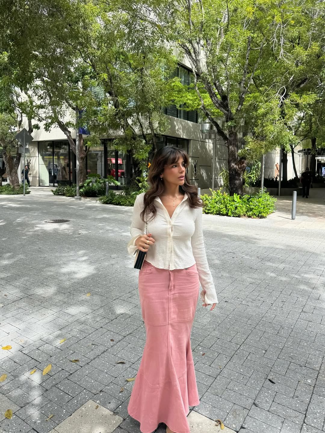 This outfit balances softness and shape beautifully. Clean lines, gentle tones, and thoughtful styling keep it from feeling too sweet.