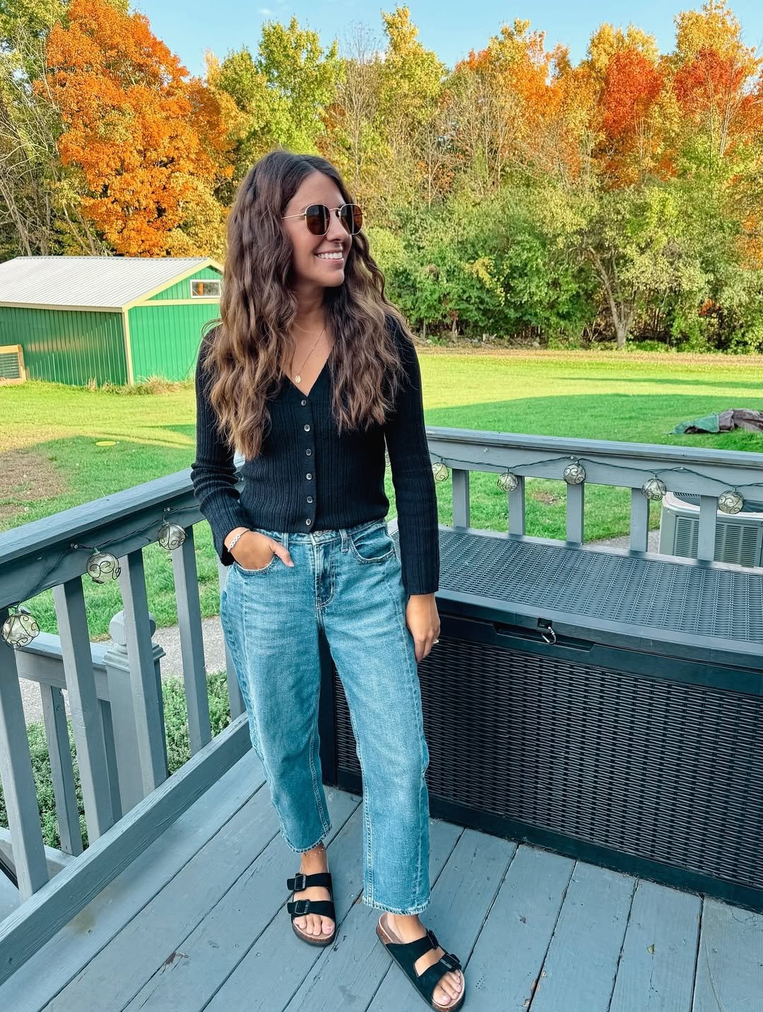 This look is proof that simple outfits hit hardest when the fit is right. A dark cardigan, relaxed denim, and easy sandals feel grounded, wearable, and quietly confident.