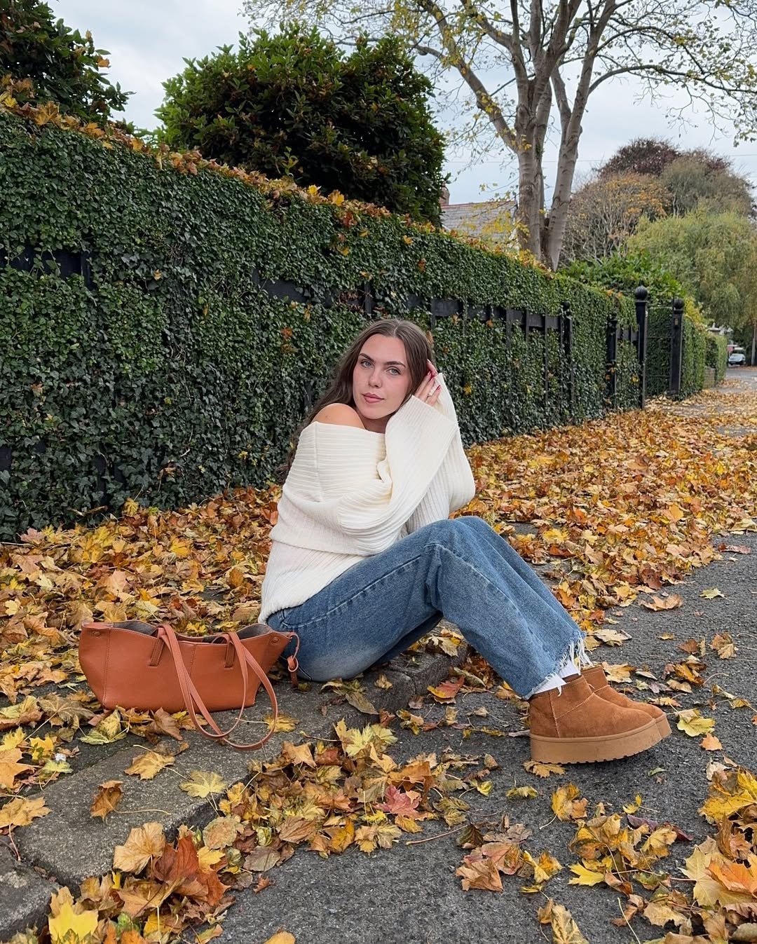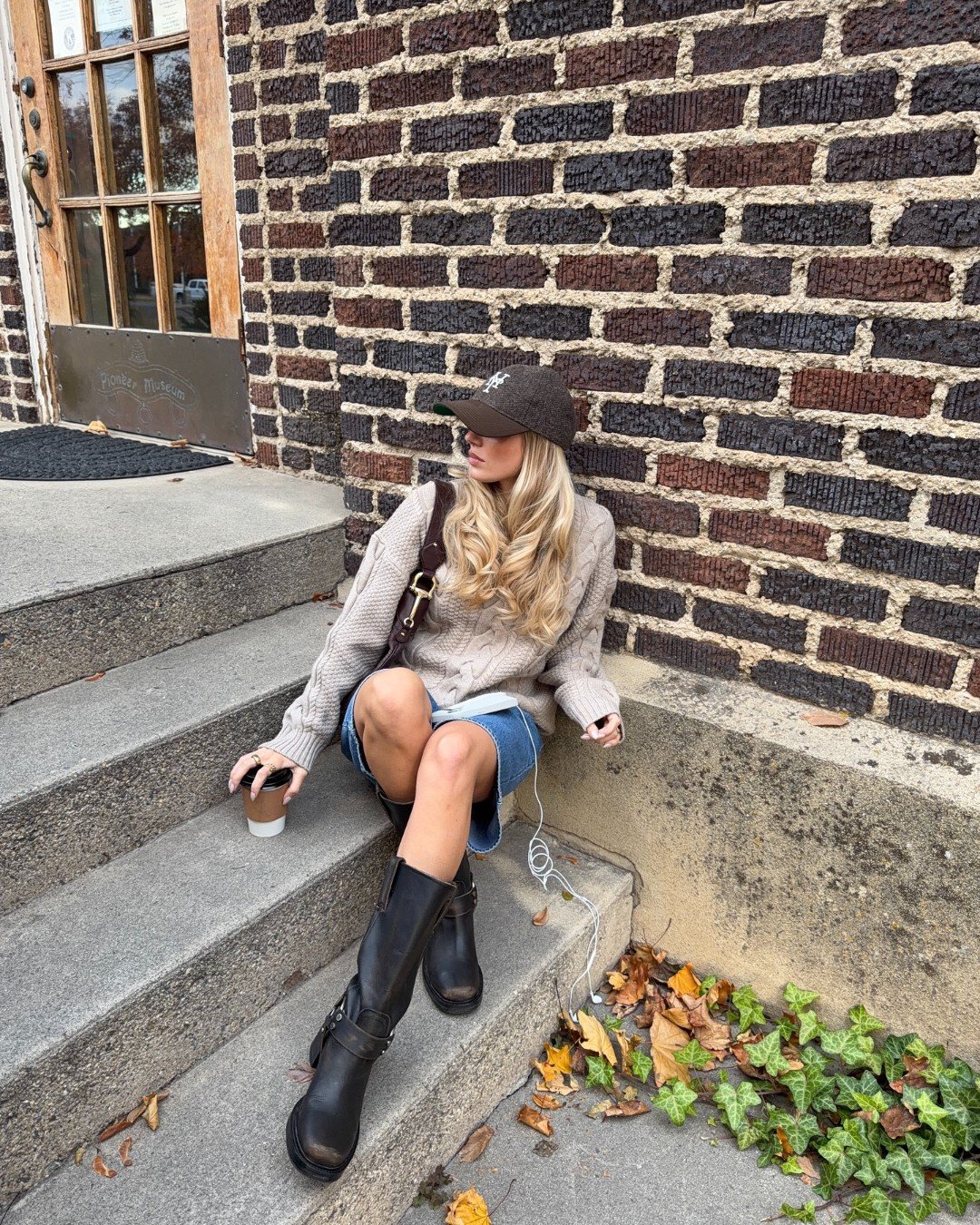Cream knits, cuffed denim, and chunky boots make this feel seasonally perfect without being costume-y.