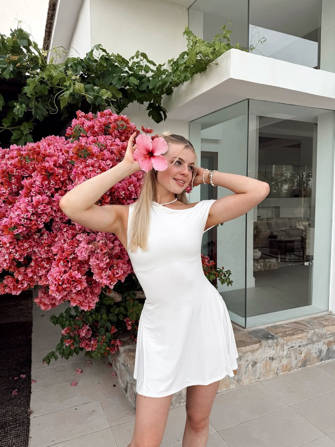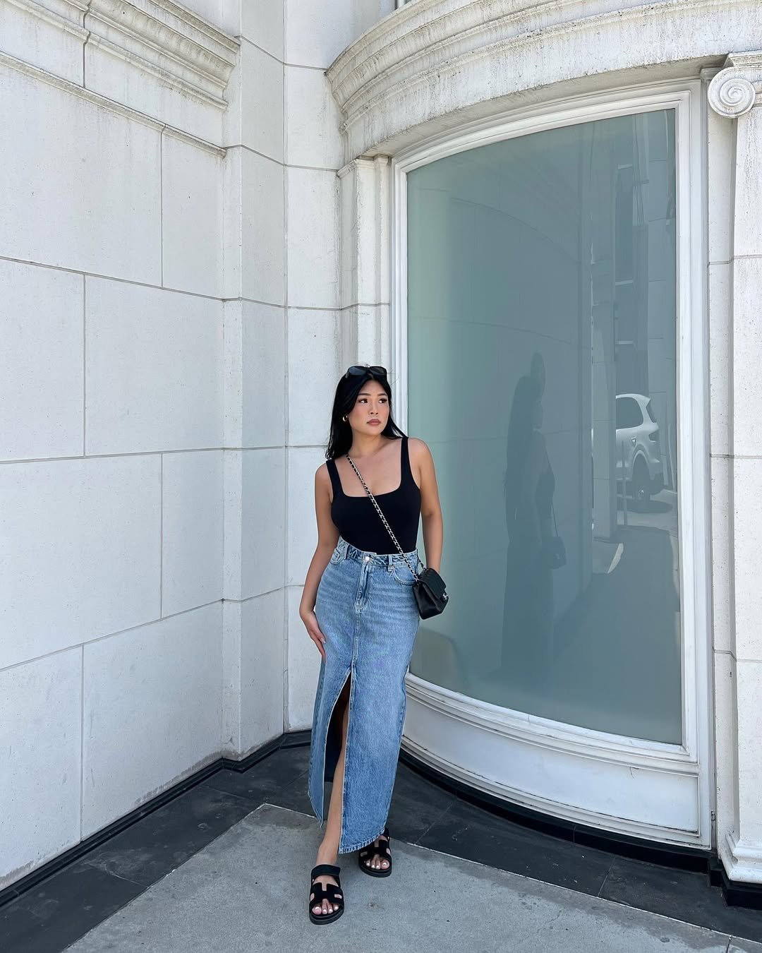 This look is minimal in the best way. A crisp tee, structured mini, and simple accessories do all the talking.
