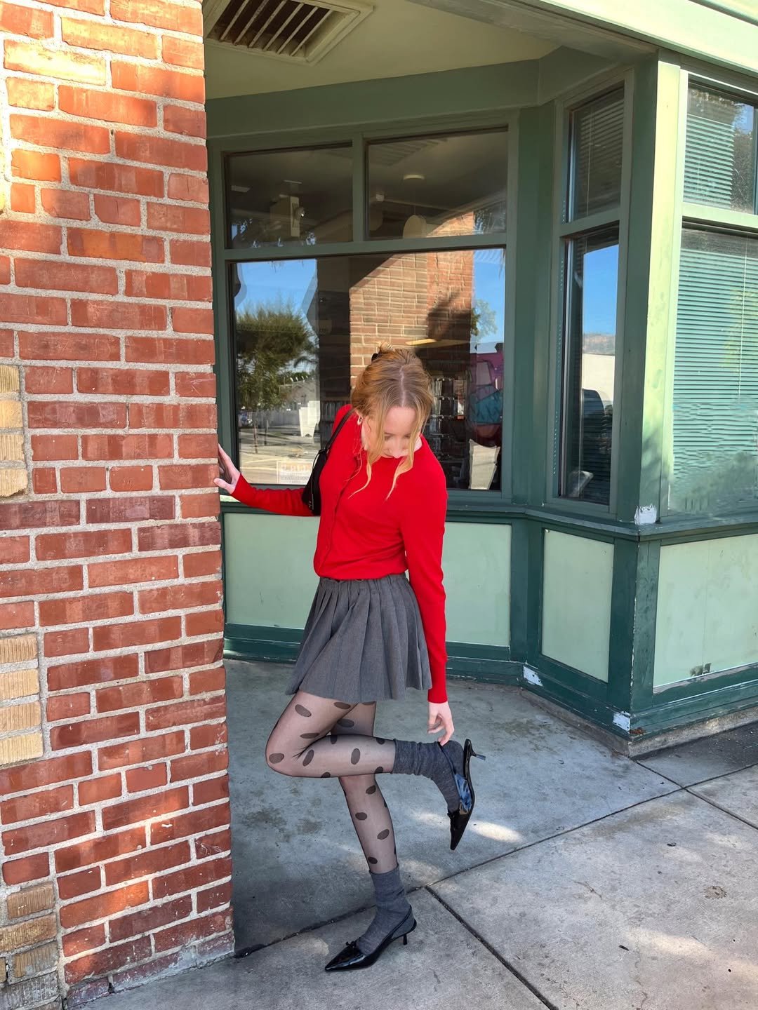 This one leans playful with a sharp edge. The red top against the pleated skirt brings that vintage-inspired vibe, but the styling keeps it modern.
