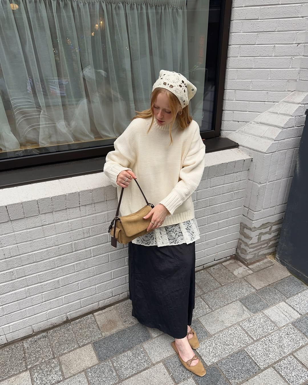 This outfit feels calm and grounded. Cream knits, relaxed shapes, and that subtle lace detail peeking out keep it interesting without screaming for attention.