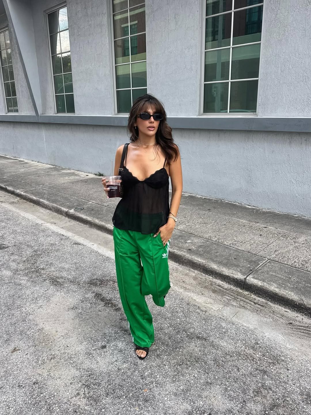 This outfit knows exactly what it’s doing. The delicate top paired with bold green track pants creates contrast that actually hits.