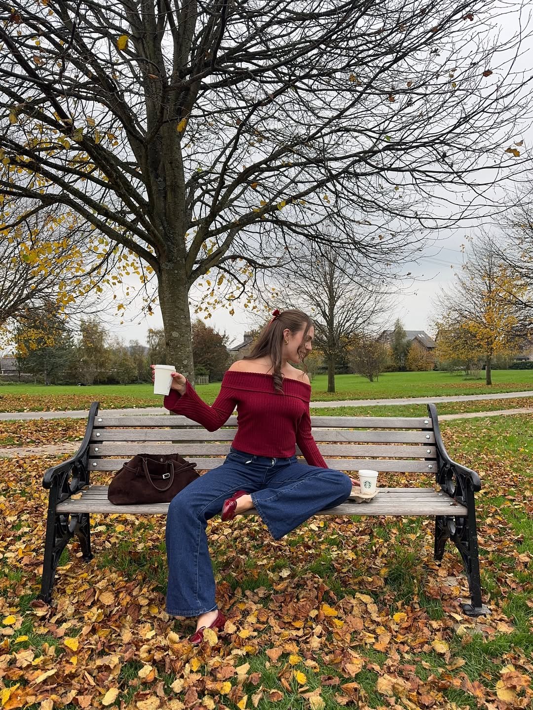 This outfit feels slower, calmer, and a little more romantic. The off-shoulder knit paired with wide-leg denim hits that cozy-but-pretty balance.