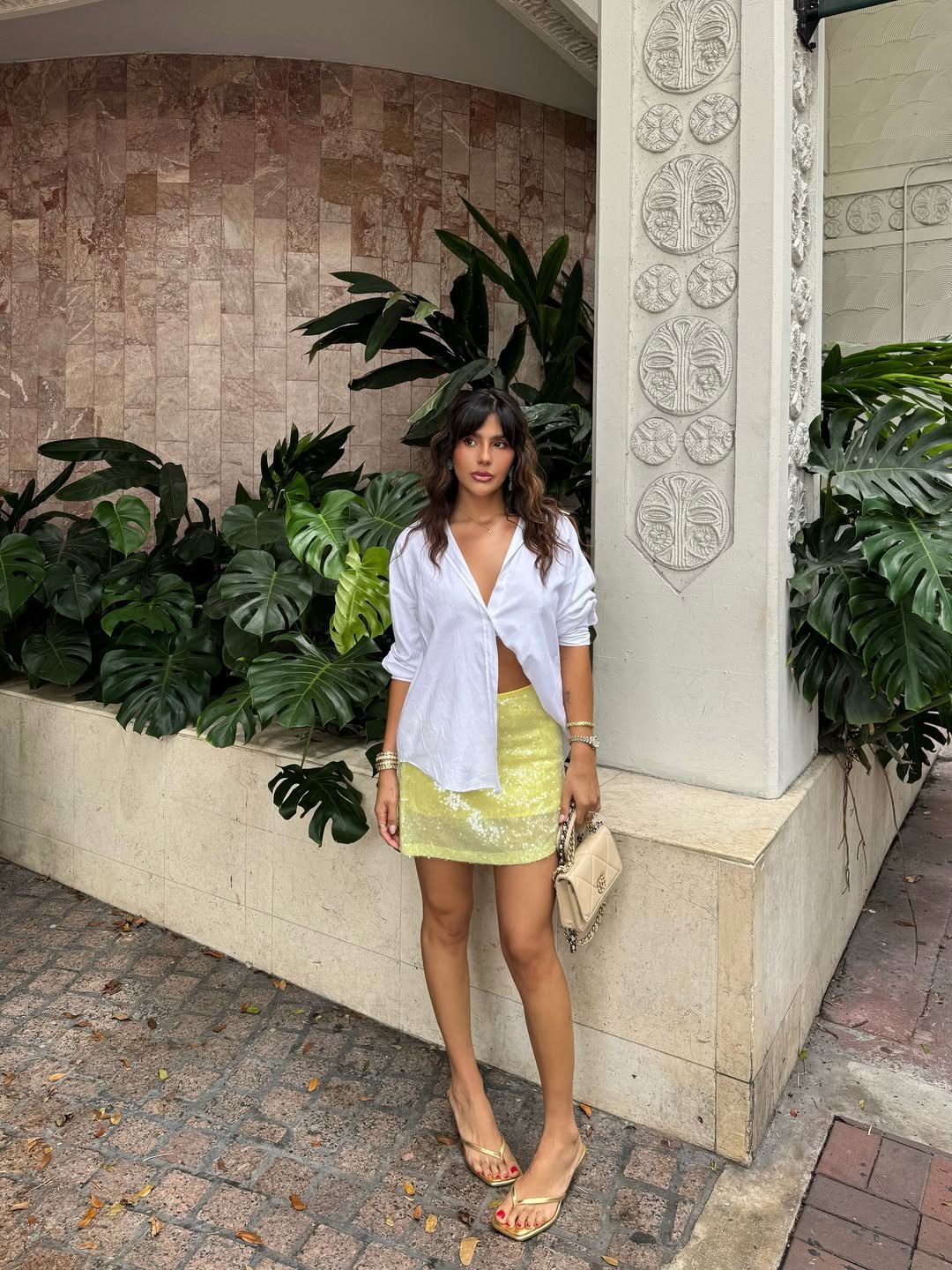 This look balances soft glamour with everyday ease. The open white shirt over a shimmering mini skirt feels effortless but elevated.