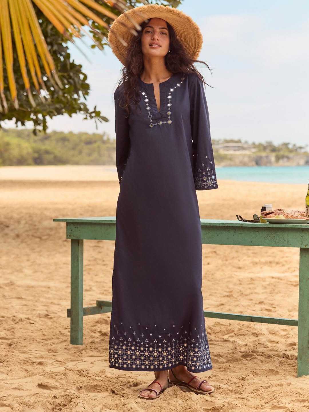 A navy maxi on the beach feels timeless. The long sleeves and delicate embroidered details add a subtle, almost artisanal charm that feels both relaxed and refined.