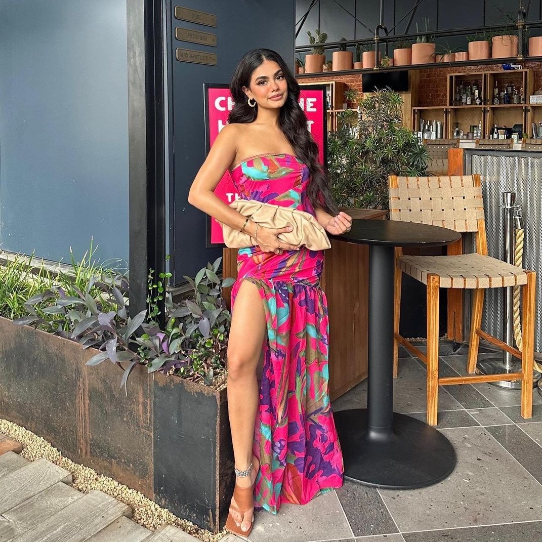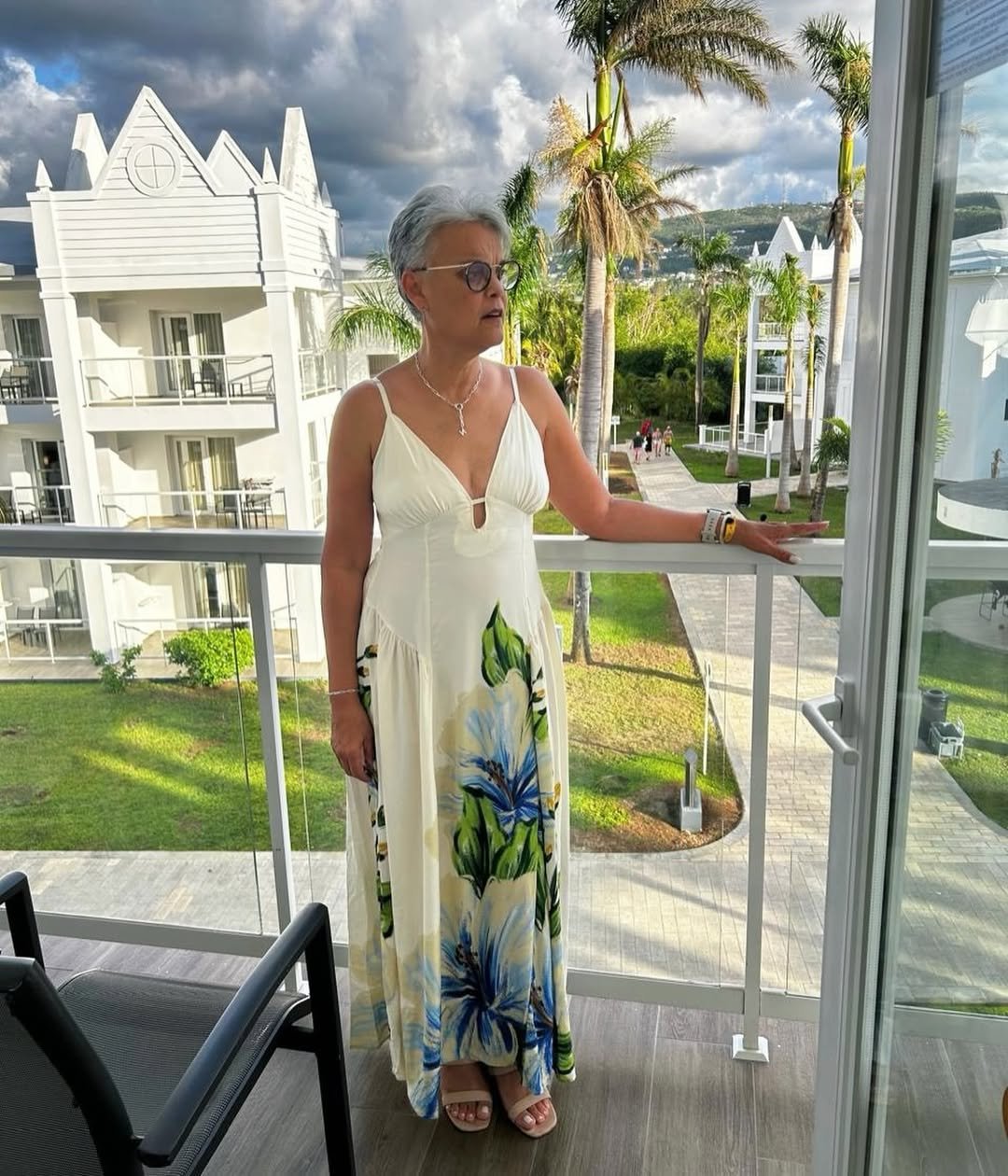 Standing under palm trees with the waves in the background, the look feels calm and carefree. It’s the kind of maxi you pack when the plan is simple, sunshine, sand, and nowhere you really need to rush.