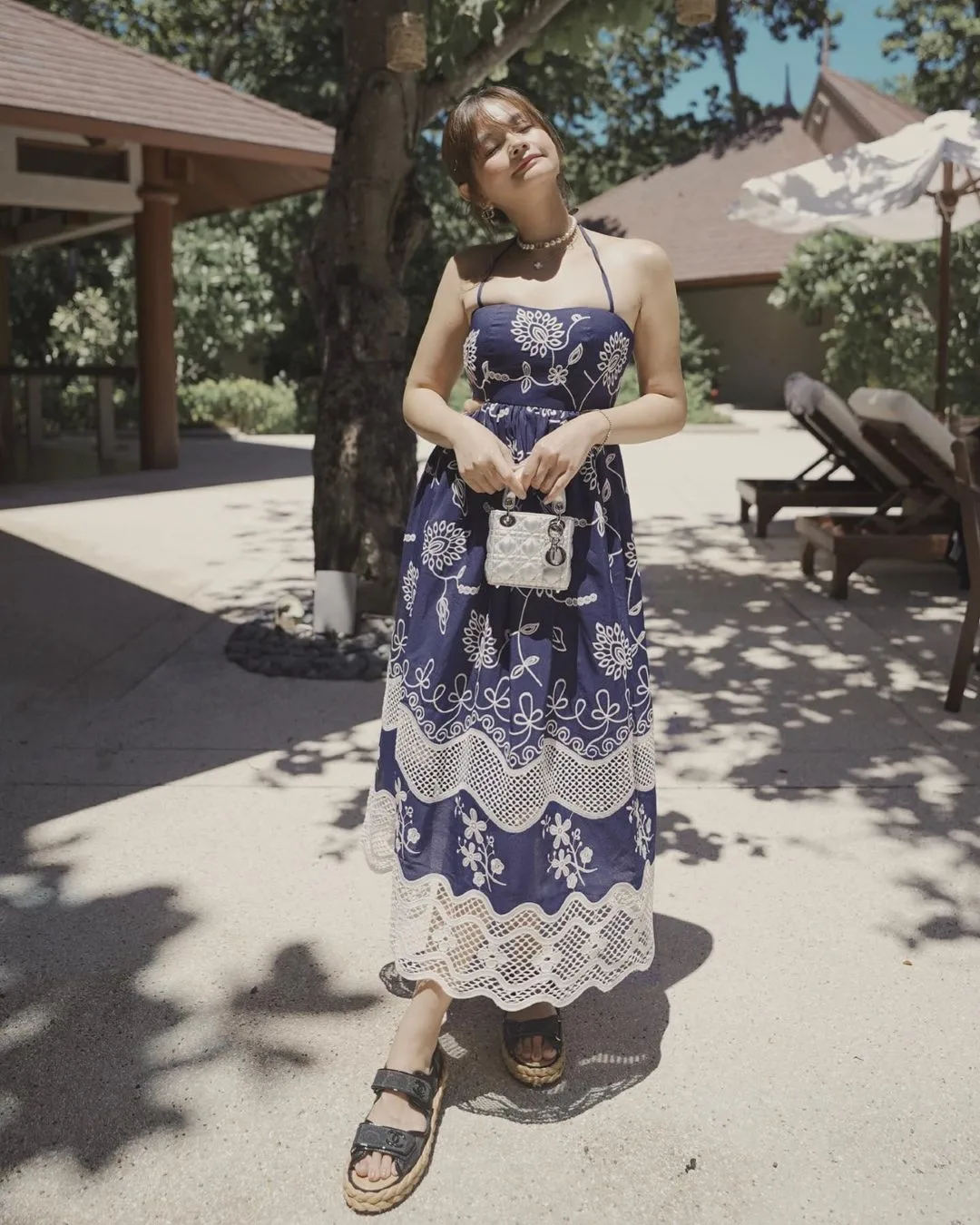 What makes it especially charming is the relaxed silhouette with pockets tucked into the skirt. It balances elegance with comfort in that perfect vacation way, the kind of dress you wear while exploring a historic villa, then drifting into a long afternoon lunch nearby.
