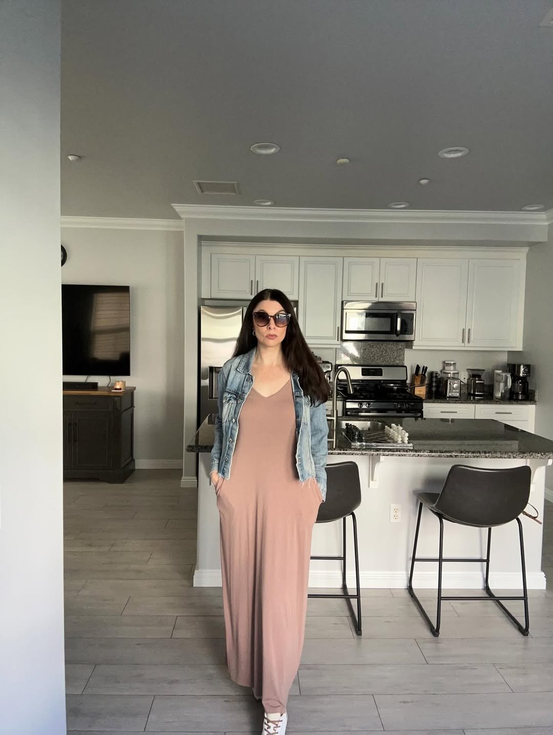 Some dresses are made for glamorous evenings, and others quietly become the ones you reach for again and again. This soft taupe maxi lives firmly in that second category. The relaxed shape paired with a classic denim jacket creates a look that feels casual but still polished.