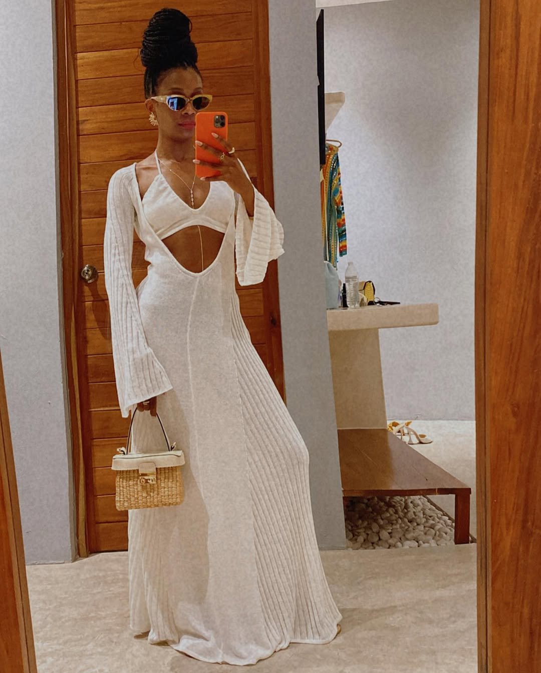 Sometimes the most striking vacation dresses are the ones that keep things simple. This black maxi with crisp white cutout details feels polished and confident, almost like it belongs at a sunset rooftop dinner overlooking the ocean. The fitted silhouette adds a touch of drama while still staying refined.