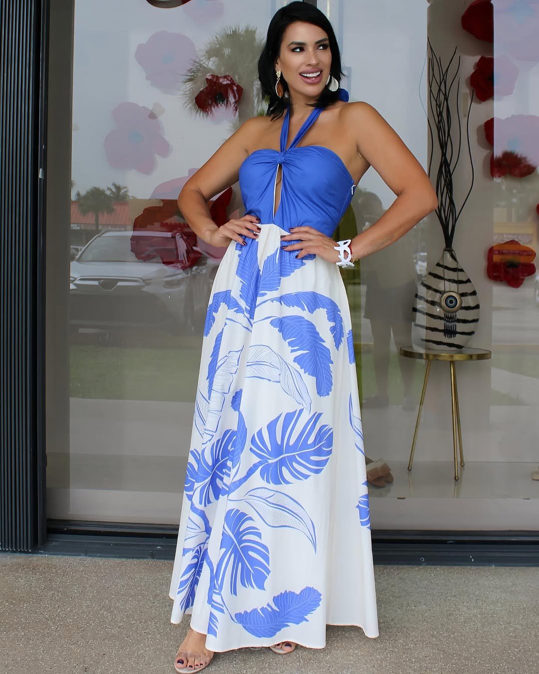 This maxi feels like it was made for tropical escapes. The blue and white palette instantly brings to mind ocean waves and palm leaves, while the halter neckline adds a little elegance.