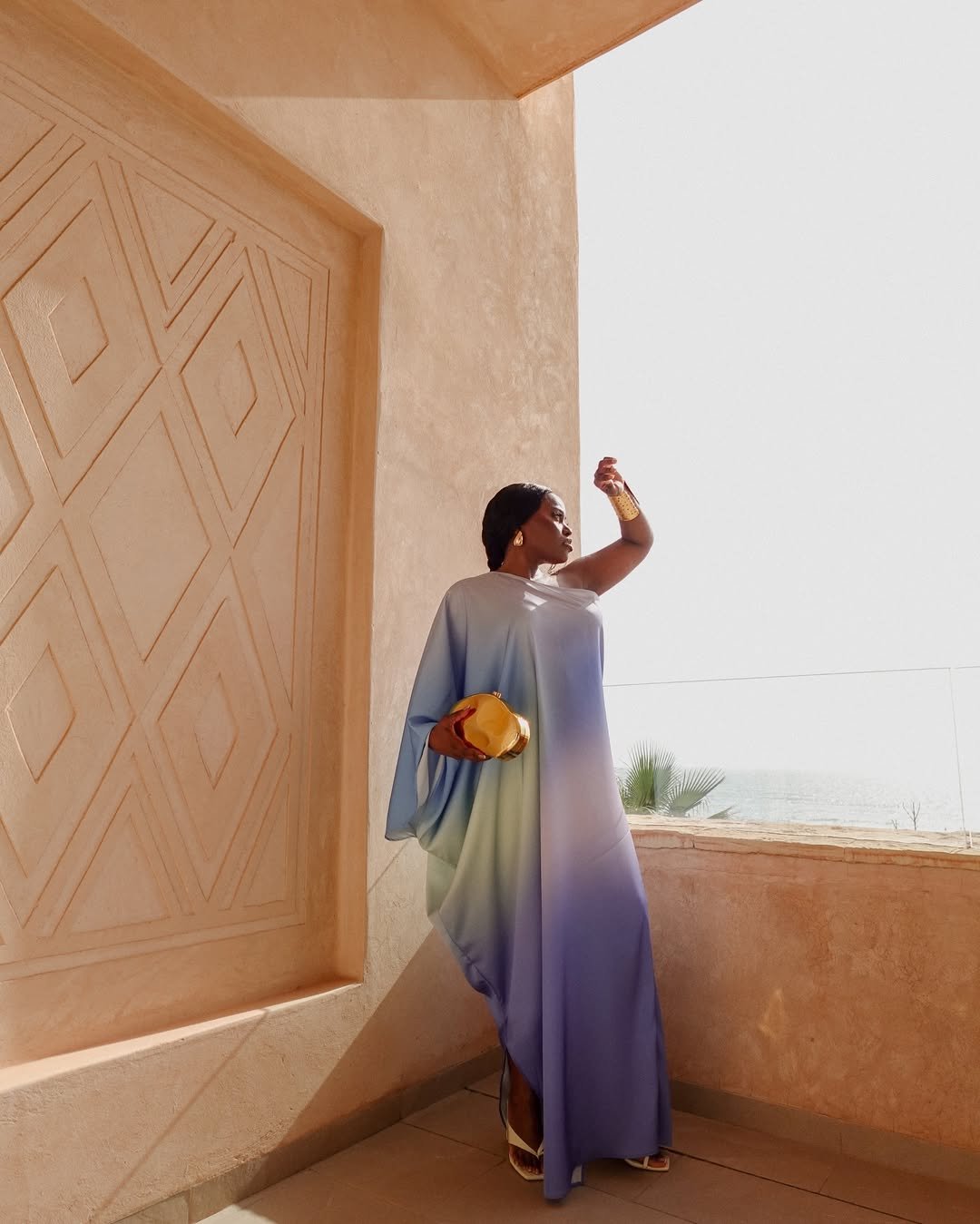 The flowing silhouette adds an almost sculptural quality, moving beautifully with every step. Paired with bold gold jewelry and that warm coastal backdrop, the whole look feels serene, artistic, and quietly luxurious.