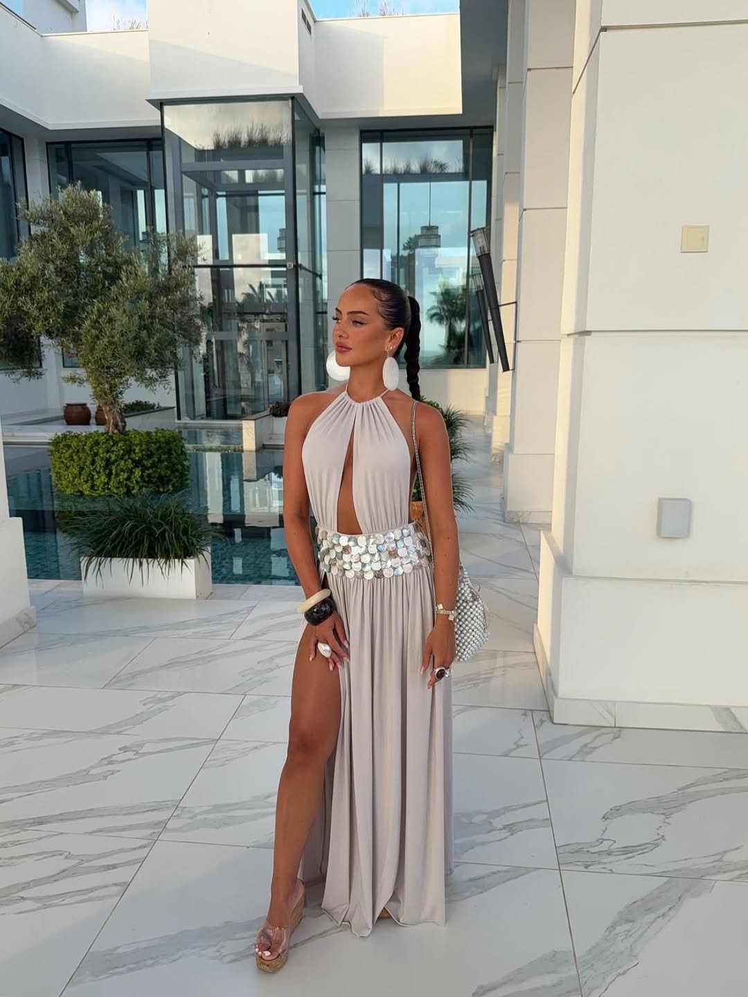 But the real star here is the shimmering disc belt that catches the light with every movement. It transforms the dress into a statement piece, perfect for sunset cocktails by the pool or an evening party somewhere warm and glamorous.