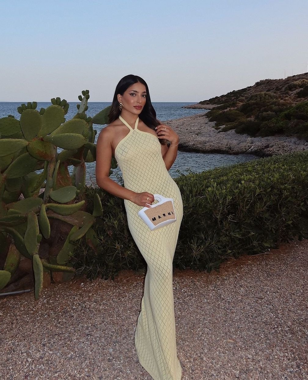 The halter neckline and waist cutout keep the silhouette flattering while the soft draping skirt adds movement. Pair it with a small woven bag like this and suddenly the whole outfit feels ready for a long lunch under lemon trees.
